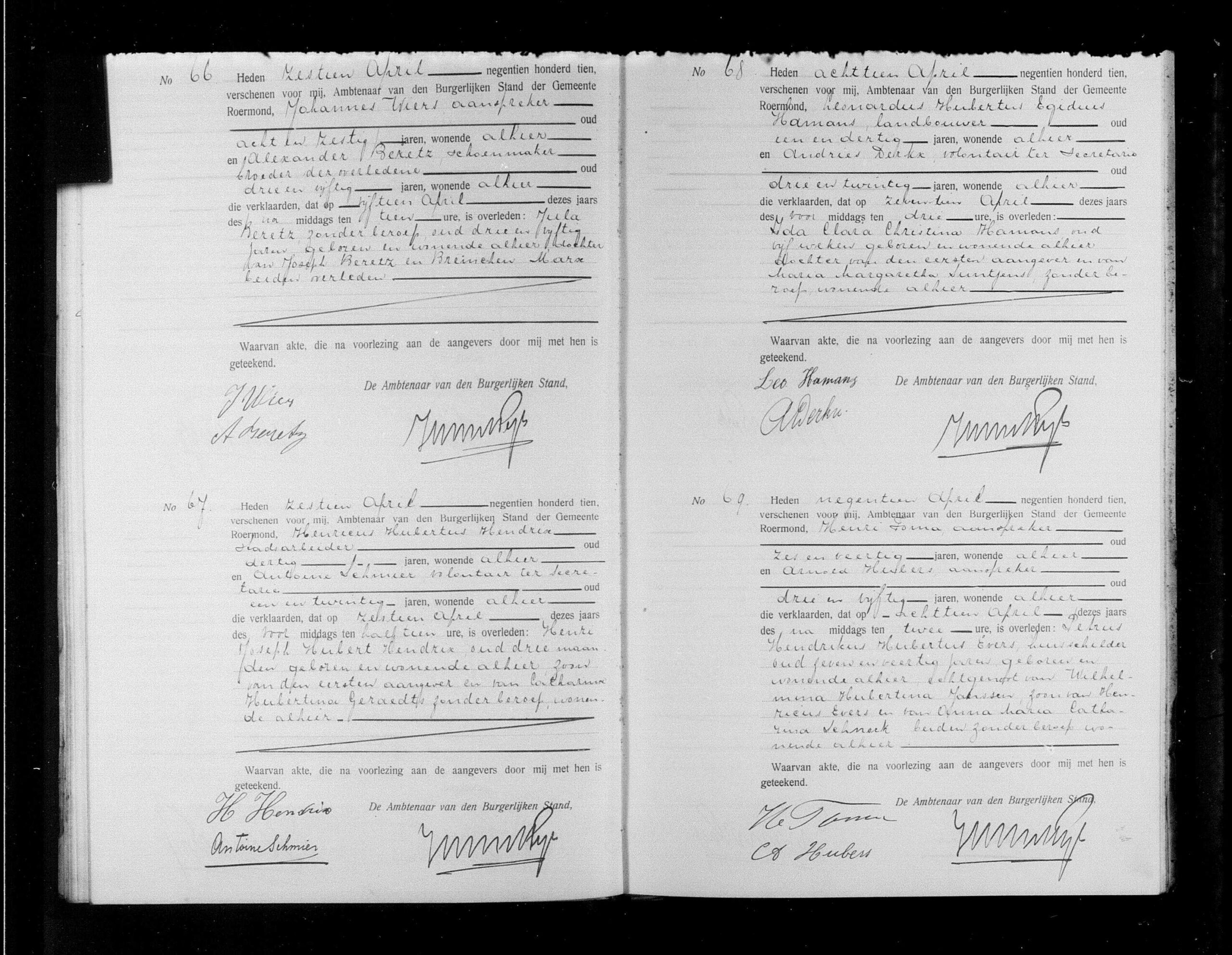 Getuigen: Carl Anton, 55 jaar oud, mercier uit Roermond en Arnold Hendrik Theodoor Hermans, 25 jaar oud, winkelier uit Roermond.