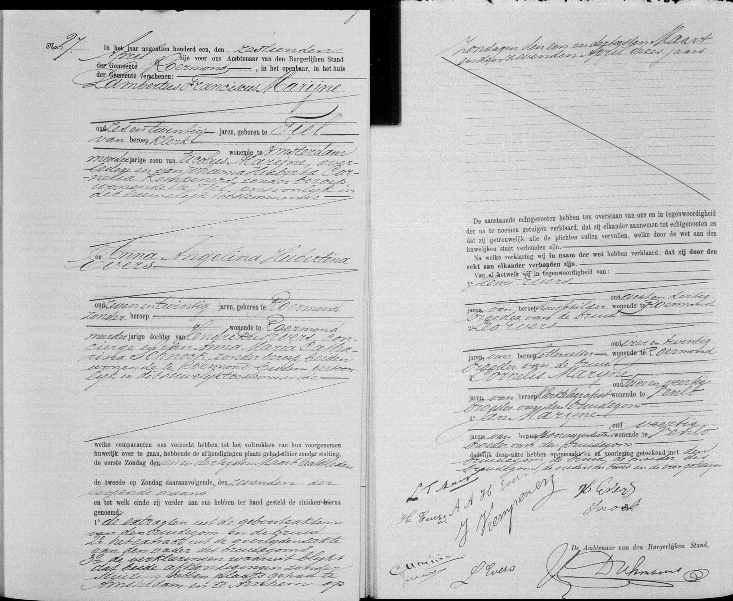 Getuigen: Henri Evers, 38 jaar oud, huisschilder uit Roermond, broer van de bruid en Leo Evers, 24 jaar oud, letterzetter uit Roermond, broer van de bruid en Cornelis Marijne, 42 jaar oud, klerktelegrafist uit Venlo, broer van de bruidegom en Jan Marijne, 40 jaar oud, spoorwegconducteur uit Venlo, broer van de bruidegom.
