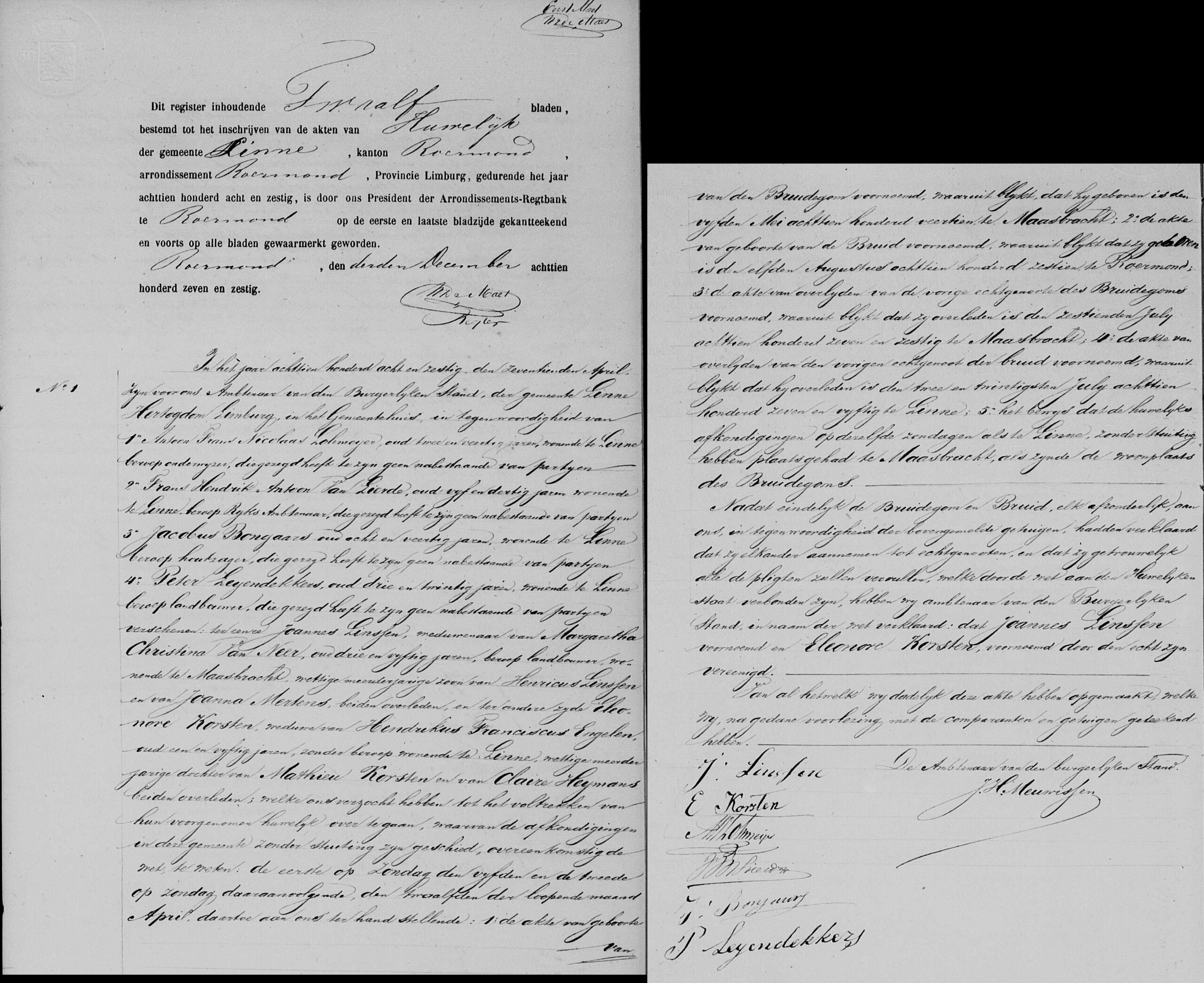 Burgerlijk huwelijk: 17 april 1868 in Linne