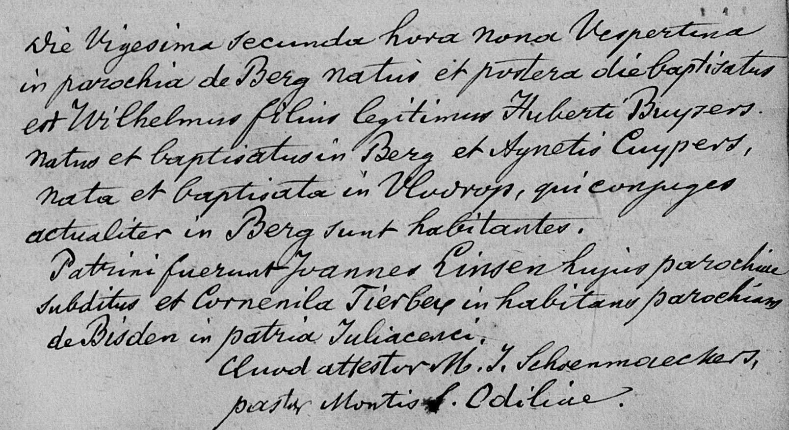 Getuigen: Joannes Linsen, uit Sint Odiliënberg en Cornelia Tierbej, uit Dieden (in ht land van Gullik).