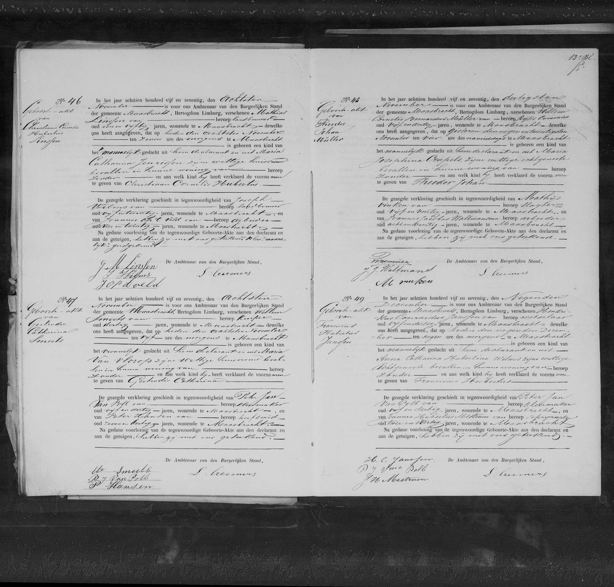 Getuigen: Joseph Wilms, 25 jaar oud, landbouwer uit Maasbracht en Joannes Op ’t Veld, 24 jaar oud, arbeider uit Maasbracht.