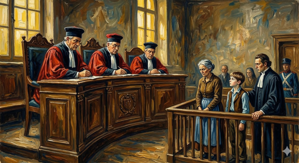 De Dag van het Vonnis Op dinsdag 8 juli 1828 is het zover. De deuren van de grote rechtszaal aan de Tongersestraat in Maastricht zwaaien open. Het is een indrukwekkende, intimiderende ruimte voor een eenvoudige dagloonster en haar twee jonge kinderen. Drie hoge rechters, in zware gewaden, kijken op hen neer: president De Limpens en de raadsheren Van de Olne en De Selys Fanson.