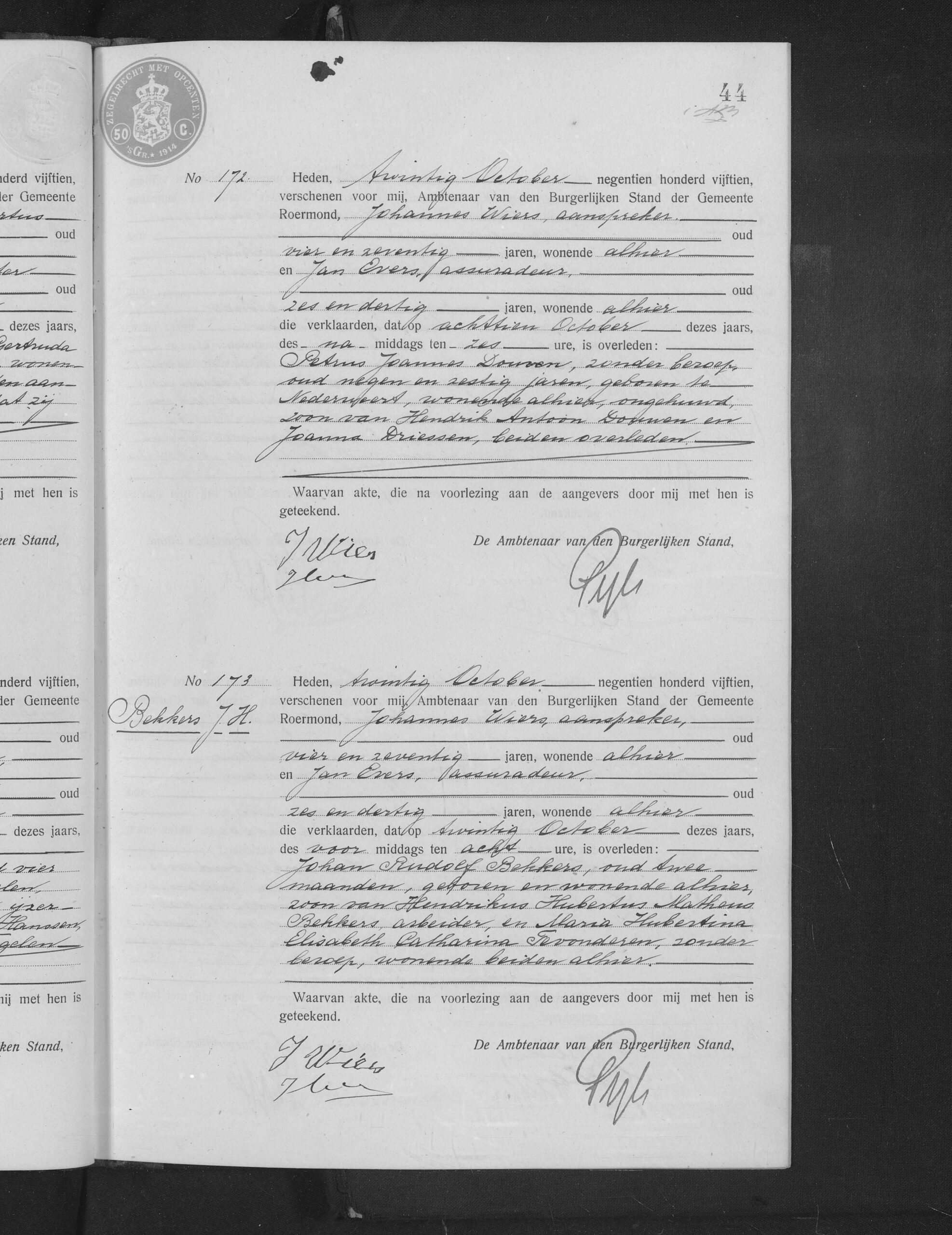 Aangevers: Johannes Wiers, 74 jaar oud, aanspreker uit Roermond en Jan Evers, 36 jaar oud, assuradeur uit Roermond.
