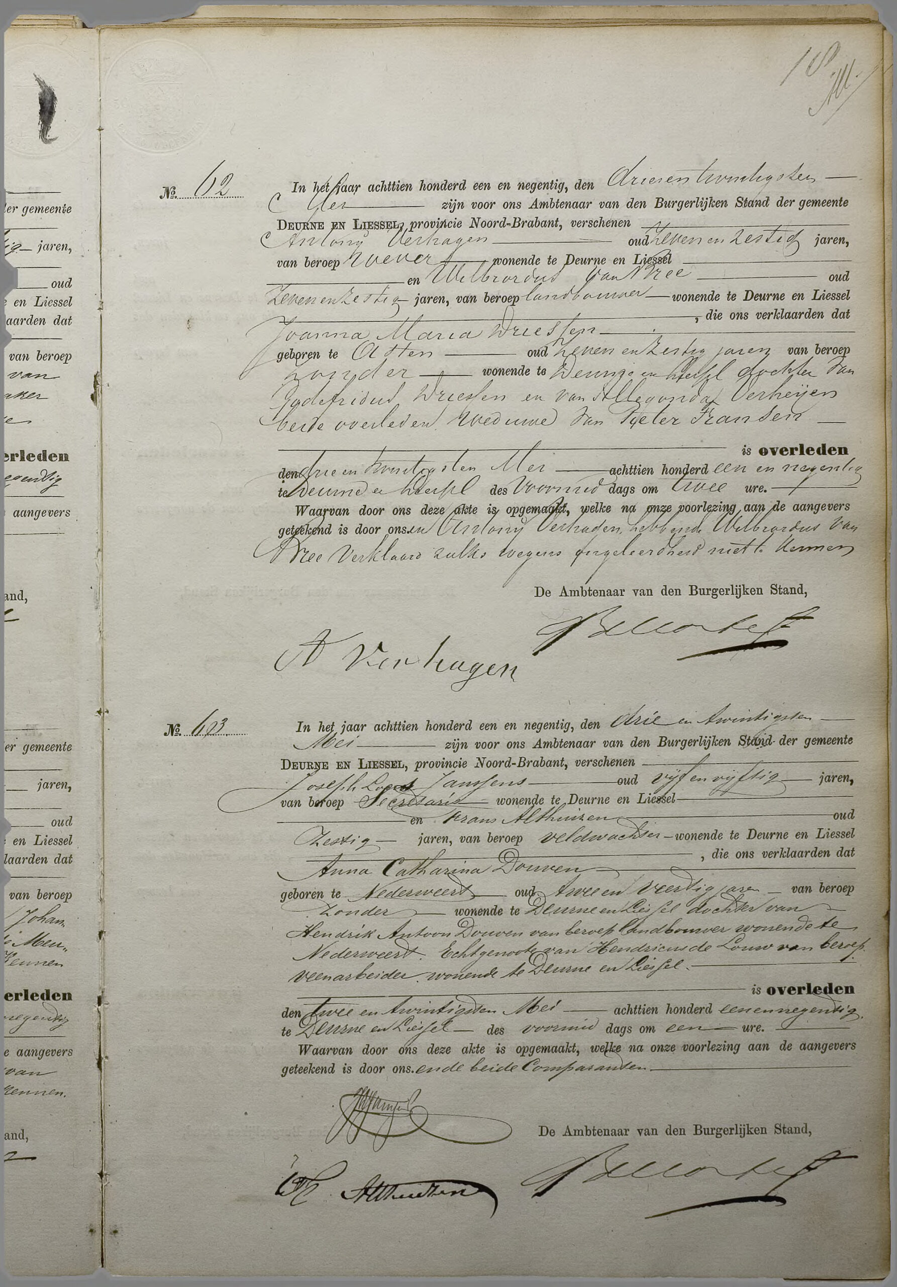 Aangevers: Josephus Janssen, 55 jaar oud, secretaris (gemeenteambtenaar) uit Deurne en Liessel en Frans Althuizen, 60 jaar oud, veldwachter uit Deurne en Liessel.