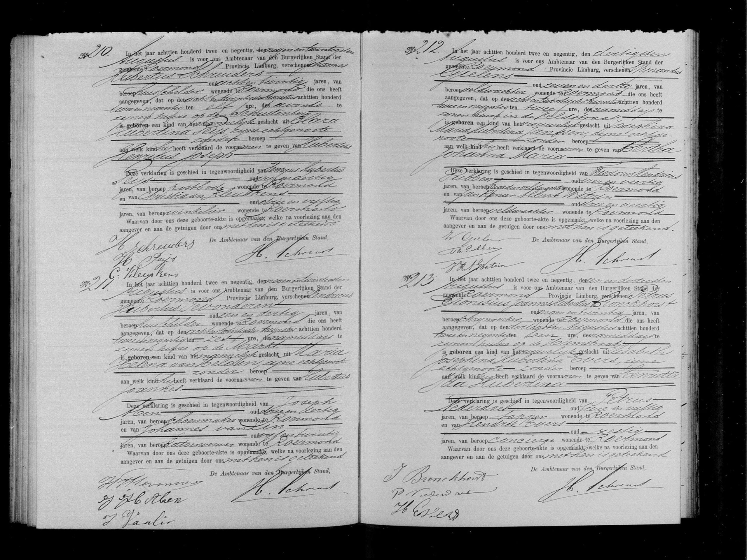 Getuigen: Petrus Dionisius Joannes Hubertus Bronckhorst, 29 jaar oud, schrijnwerker uit Roermond, vader en Petrus Nederdael, 52 jaar oud, tapper uit Roermond en Hendrik Evers, 60 jaar oud, conciërge uit Roermond, grootvader.
