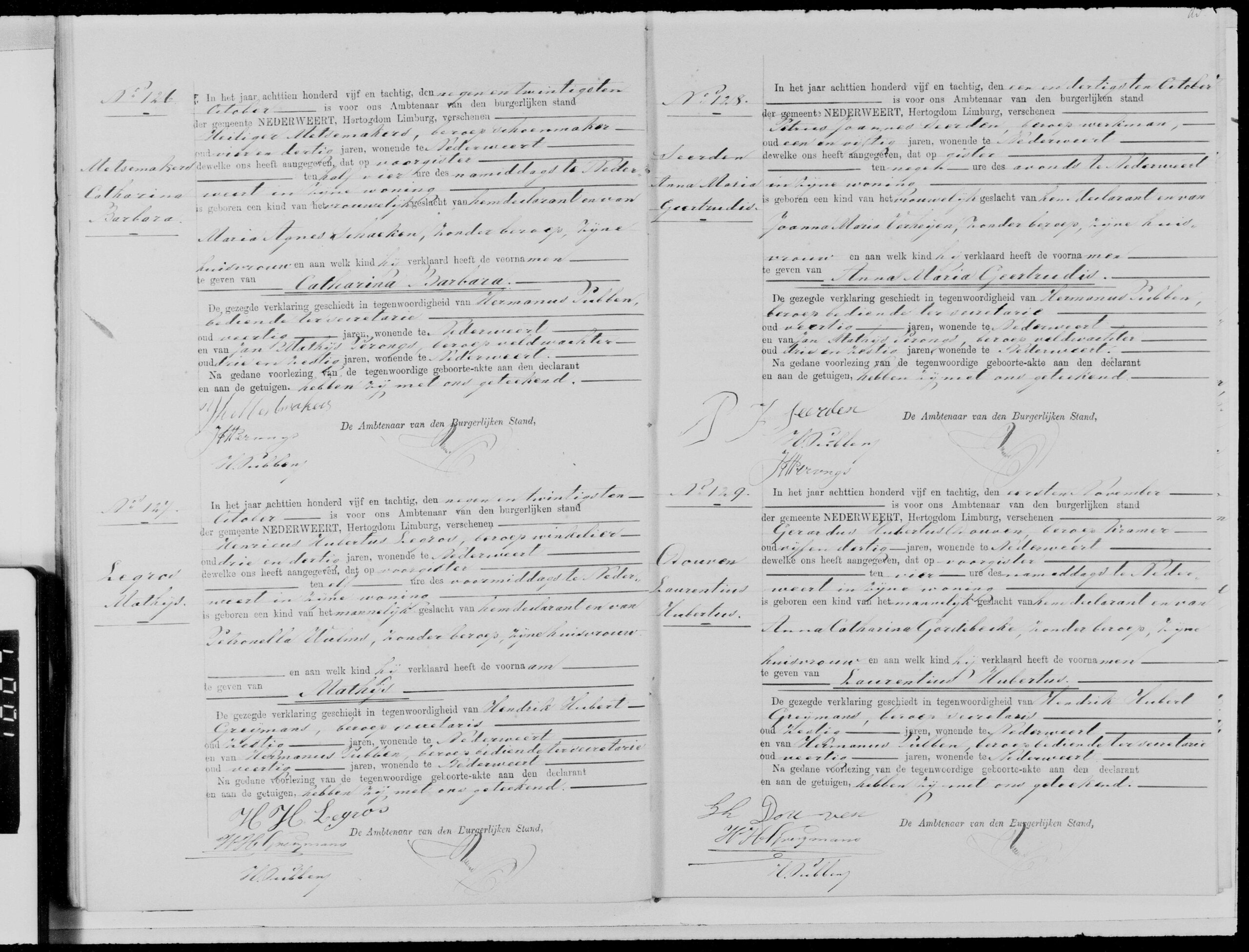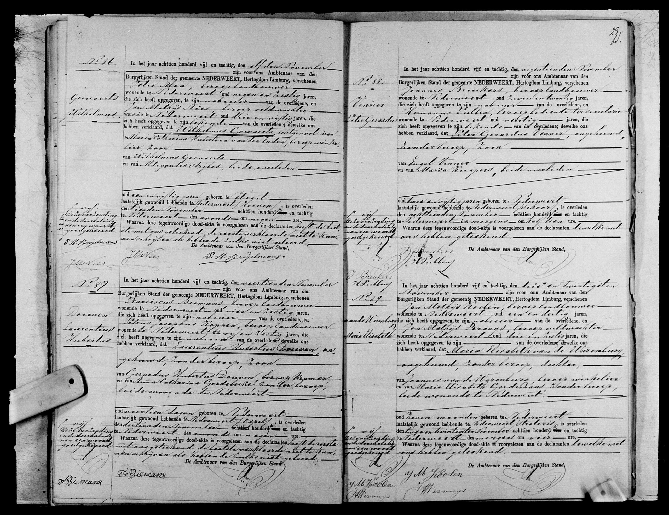 Getuigen: Hendrik Hubert Greijmans, 60 jaar oud, secretaris uit Nederweert en Hermanus Pubben, 60 jaar oud, bediende ter secretarie uit Nederweert.