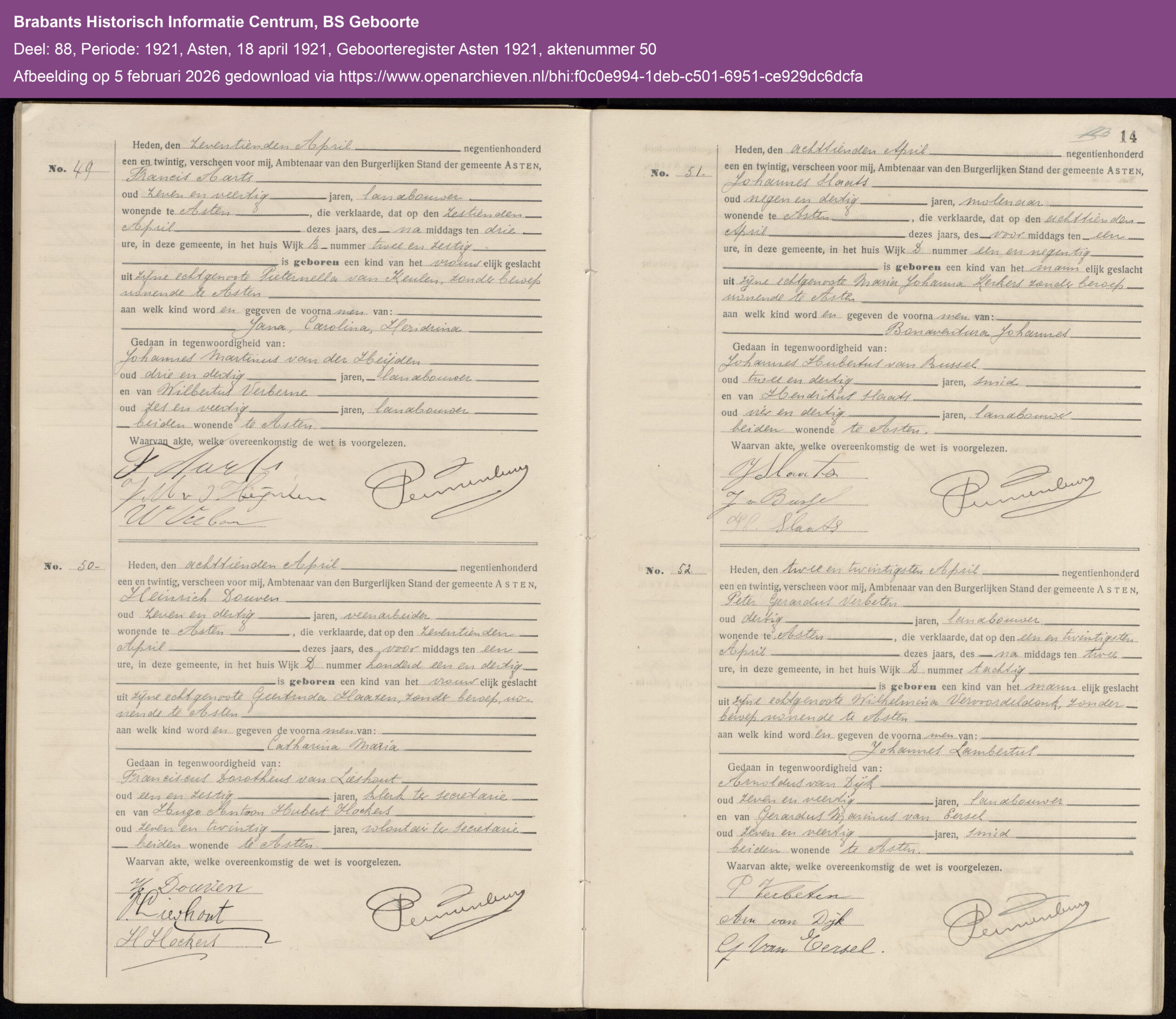 Getuigen: Feanciscus Dorotheus van Lieshout, 61 jaar oud, klerk ter secretarie uit Asten en Hugo Antoon Hubert Hoeber, 27 jaar oud, volontair ter secretarie uit Asten.