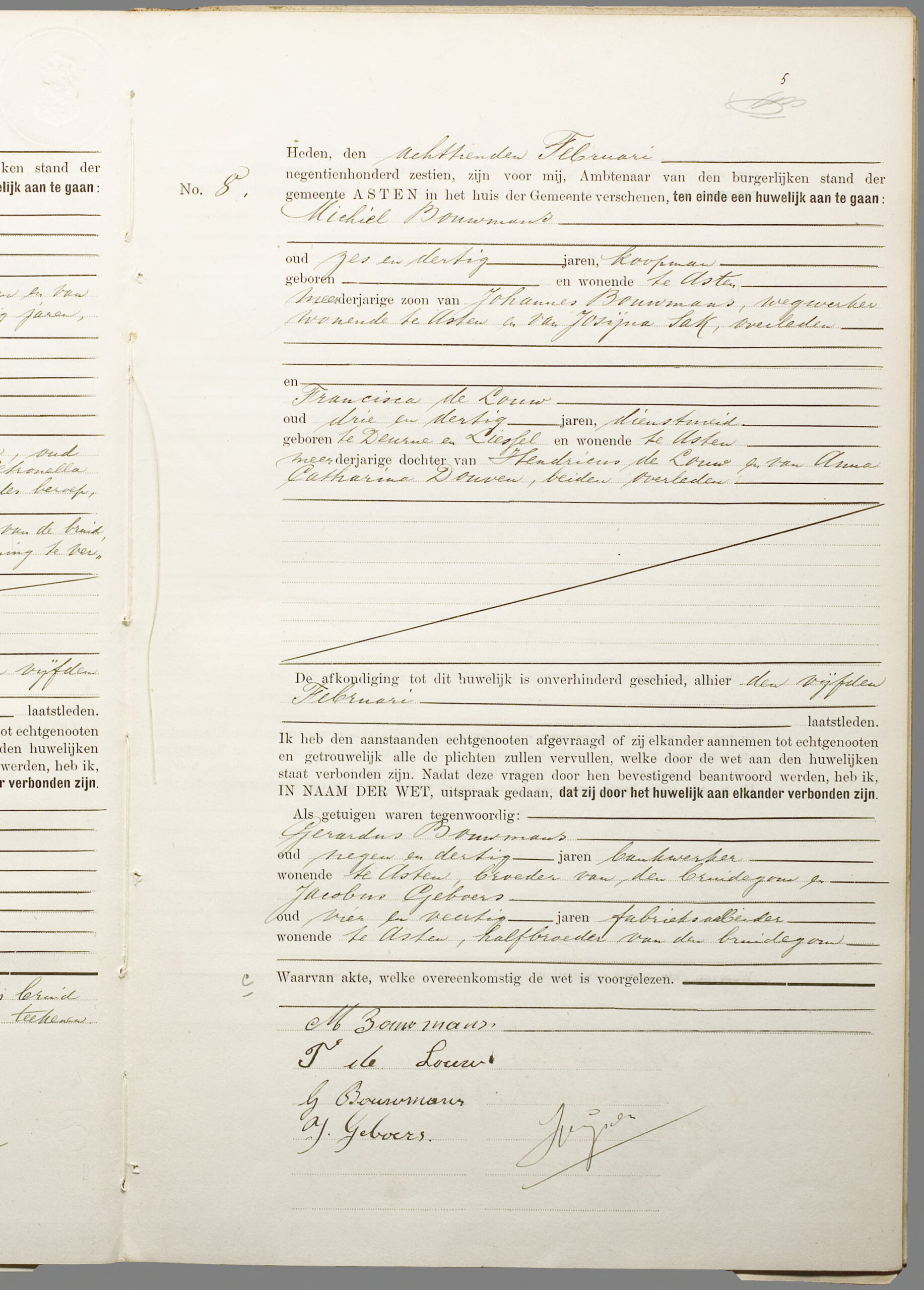 Getuigen: Gerardus Bouwmans, 39 jaar oud, bankwerker uit Asten, broer van de bruidegom en Jacobus Geboers, 44 jaar oud, fabrieksarbeider uit Asten, halfbroer van de bruidegom.