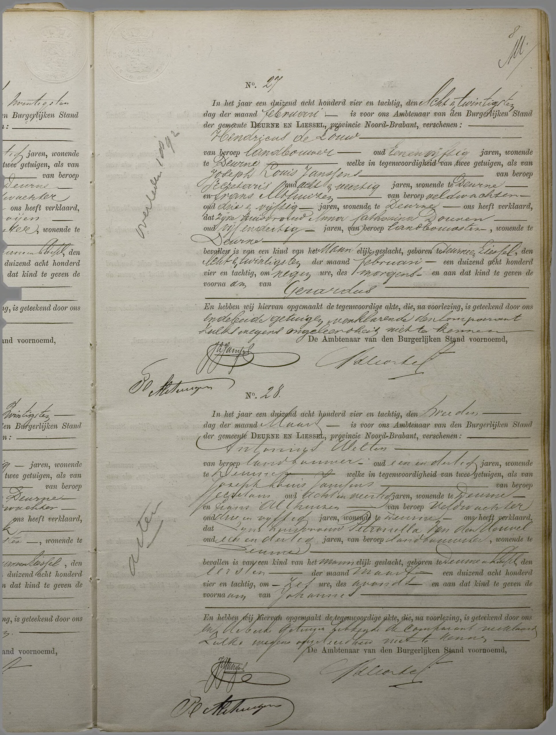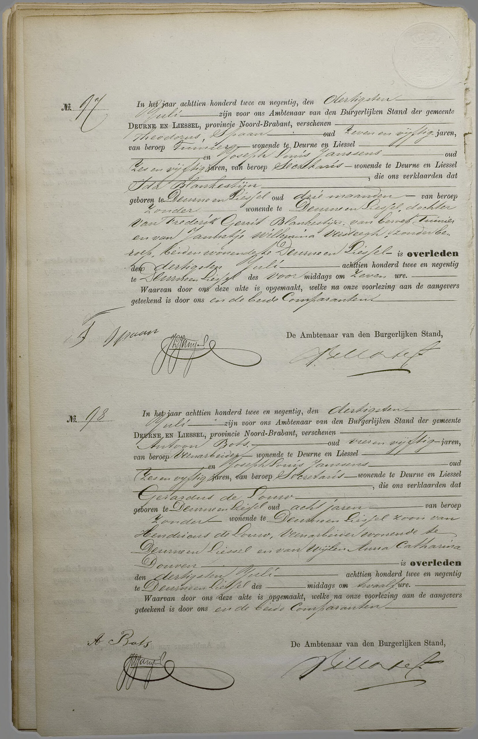 Getuigen: Joseph Louis Janssens, 48 jaar oud, secretaris uit Deurne en Frans Althuizen, 53 jaar oud, veldwachter uit Deurne.