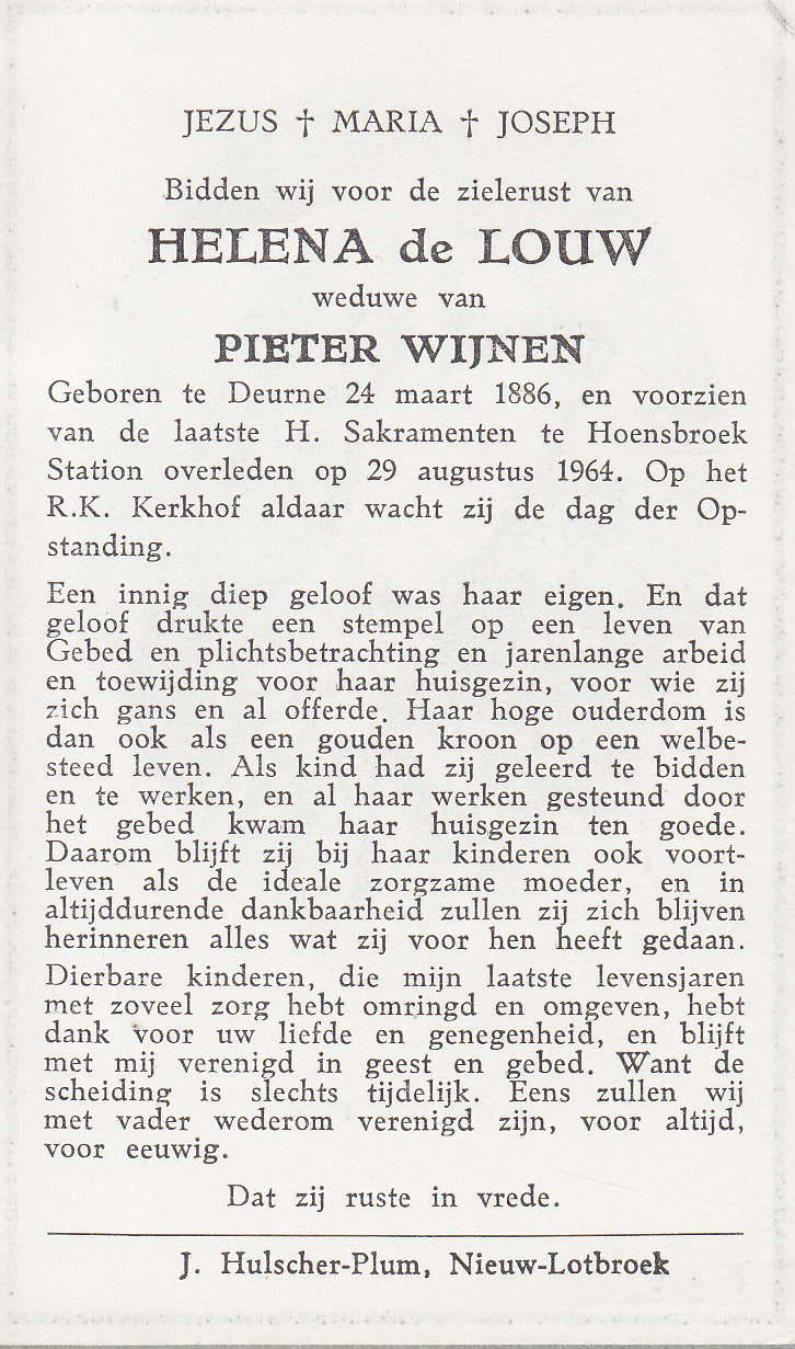 Tekst van haar bidprentje: Een innig diep geloof was haar eigen. En dat geloof drukte een stempel op een leven van Gebed en plichtsbetrachting en jarenlange arbeid en toewijding voor haar huisgezin, voor wie zij zich gans en al offerde. Haar hoge ouderdom is dan ook als een gouden kroon op een welbesteed leven. Als kind had zij geleerd te bidden en te werken, en al haar werken gesteund door het gebed kwam haar huisgezin ten goede. Daarom blijft zij bij haar kinderen ook voortleven als de ideale zorgzame moeder, en in altijddurende dankbaarheid zullen zij zich blijven herinneren alles wat zij voor hen heeft gedaan.
