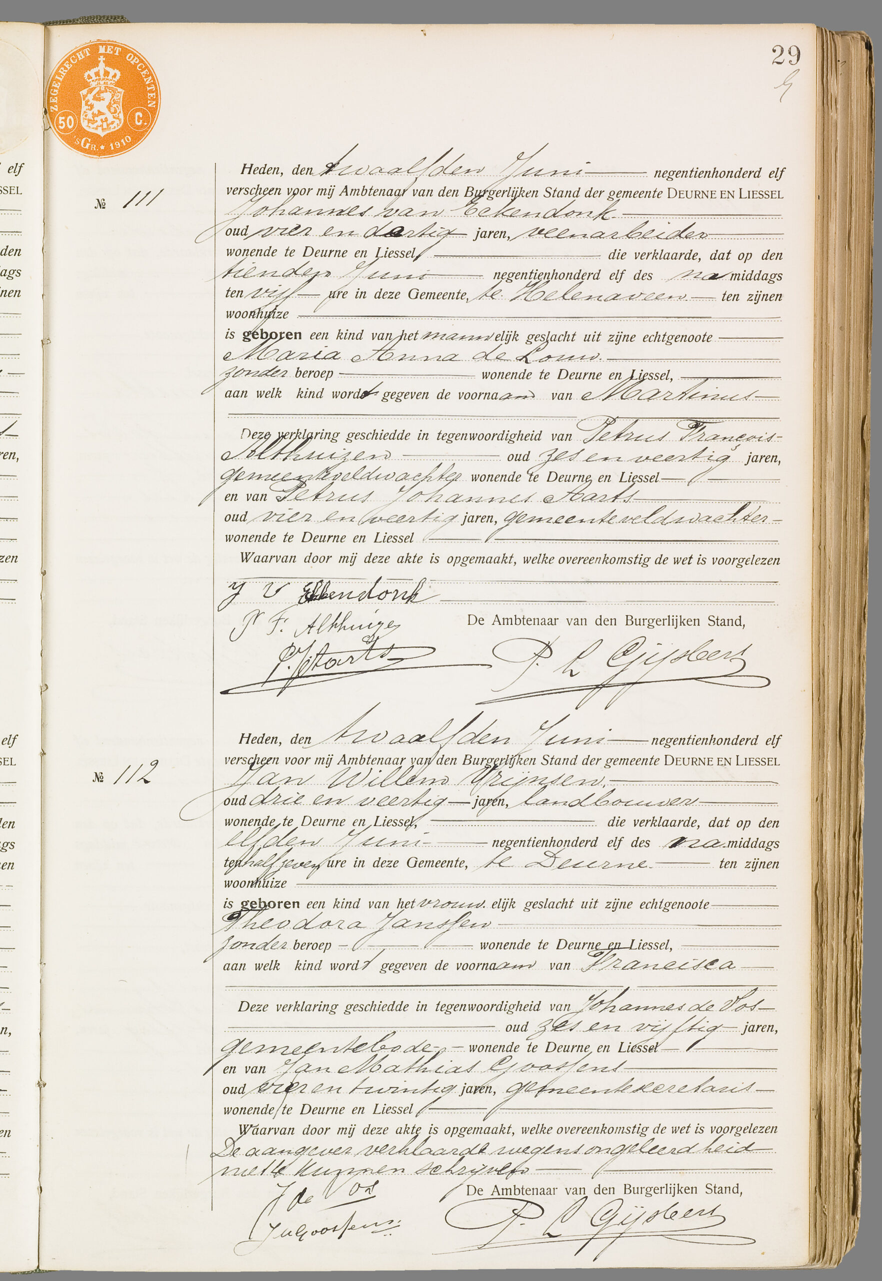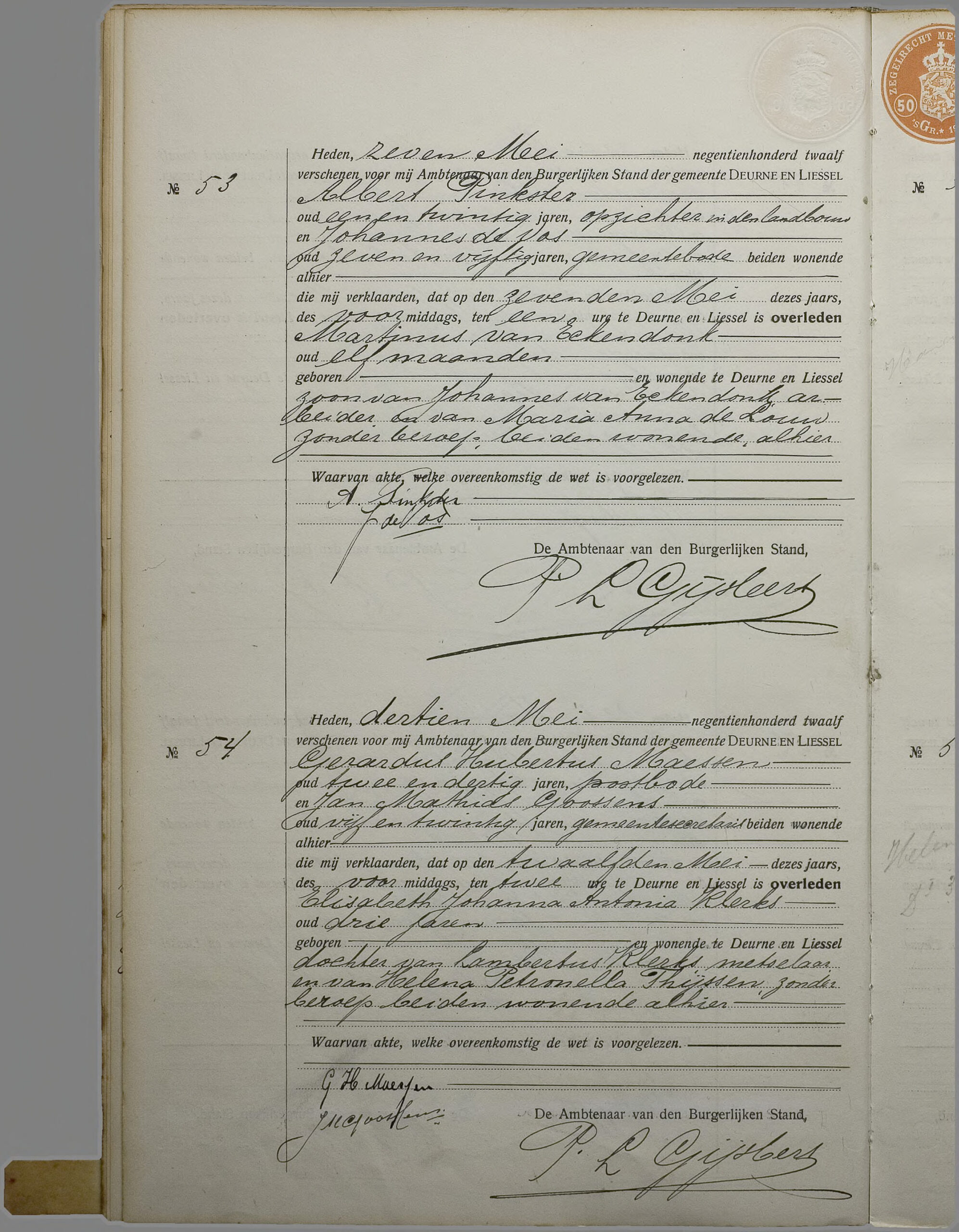 Getuigen: Petrus Francois Althuizen, 46 jaar oud, gemeenteveldwachter en Petrus Johannes Aarts, 44 jaar oud, gemeenteveldwachter.