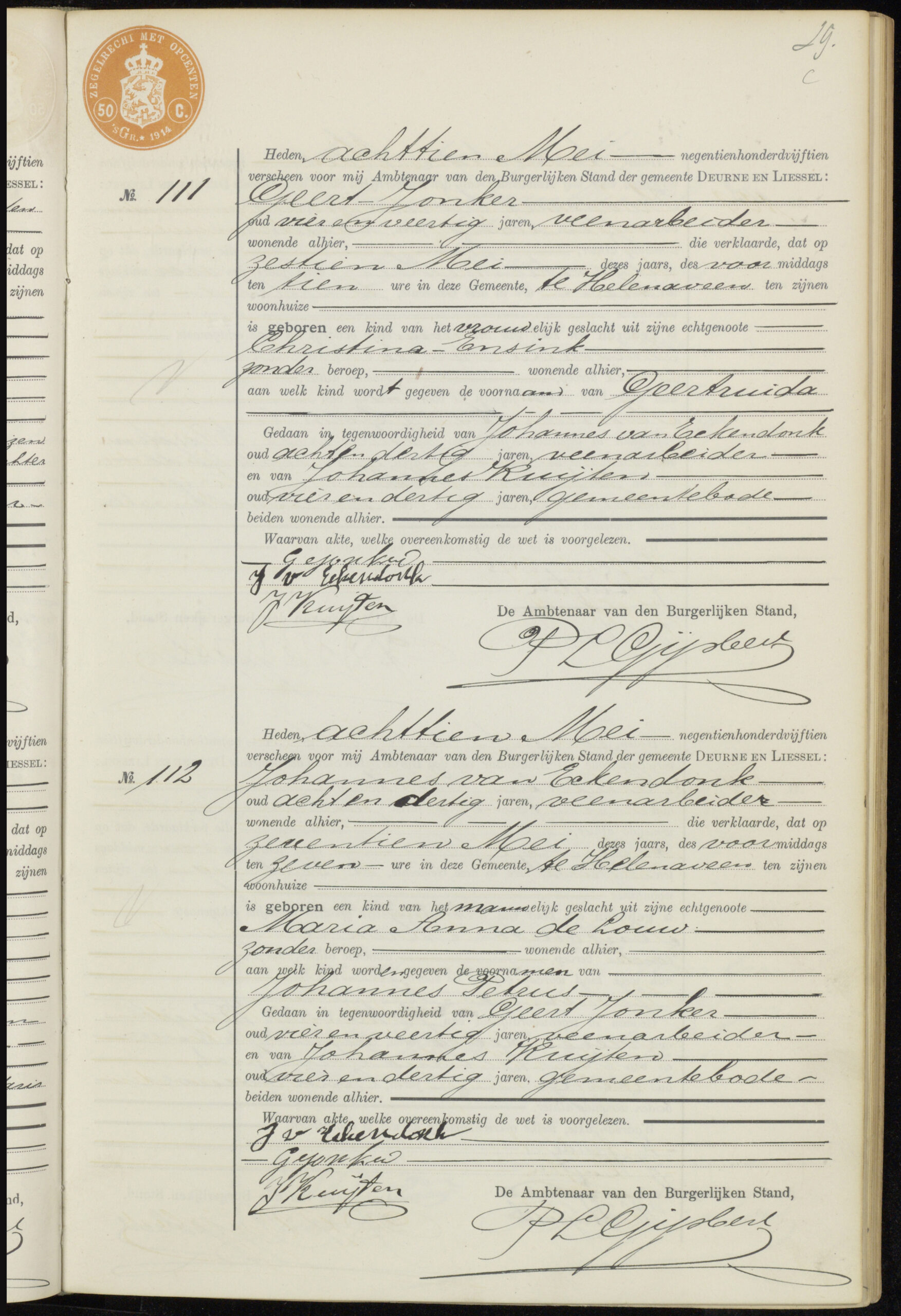 Getuigen: Geert Jonker, 44 jaar oud, veenarbeider en Johannes Kuijten, 44 jaar oud, gemeentebode.