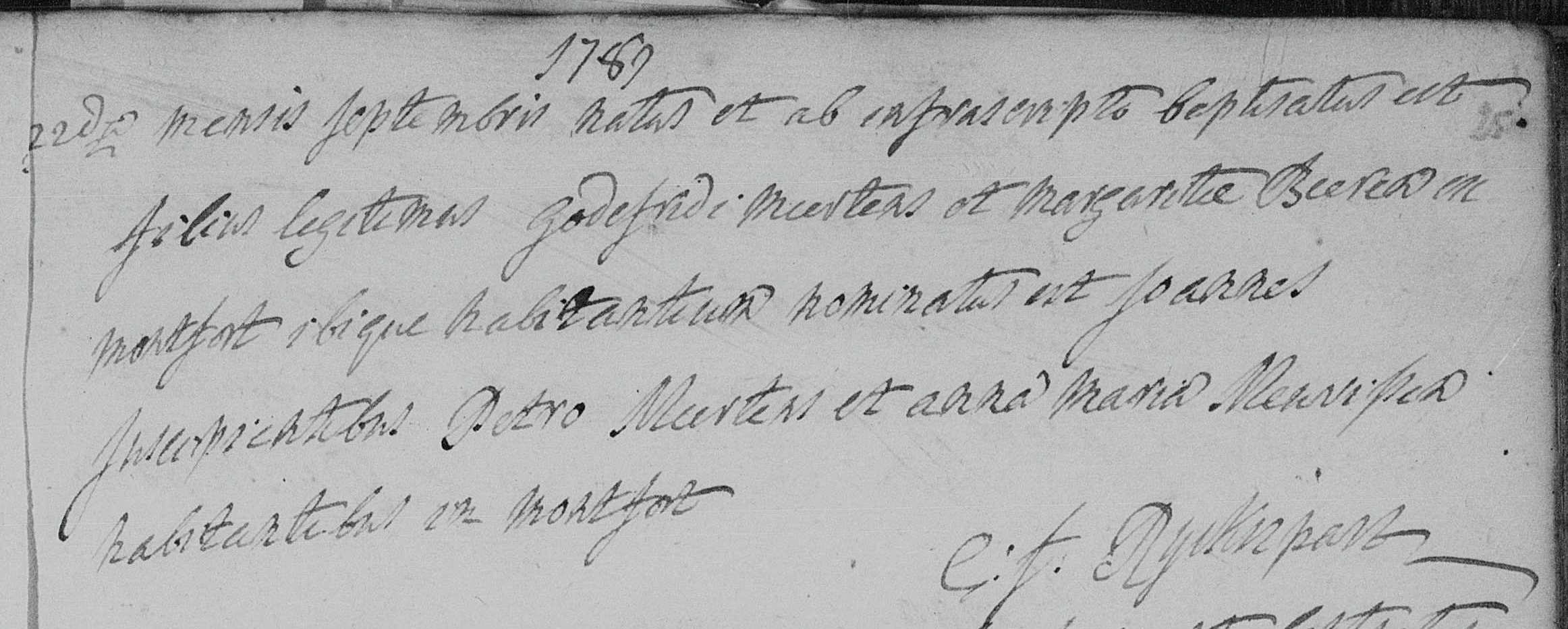 De dopeling genaamd Joannes is op dezelfde dag geboren en gedoopt, en is de wettige zoon van Godefridus Meertens en Margarita Beeren, beiden wonend te Montfort.
