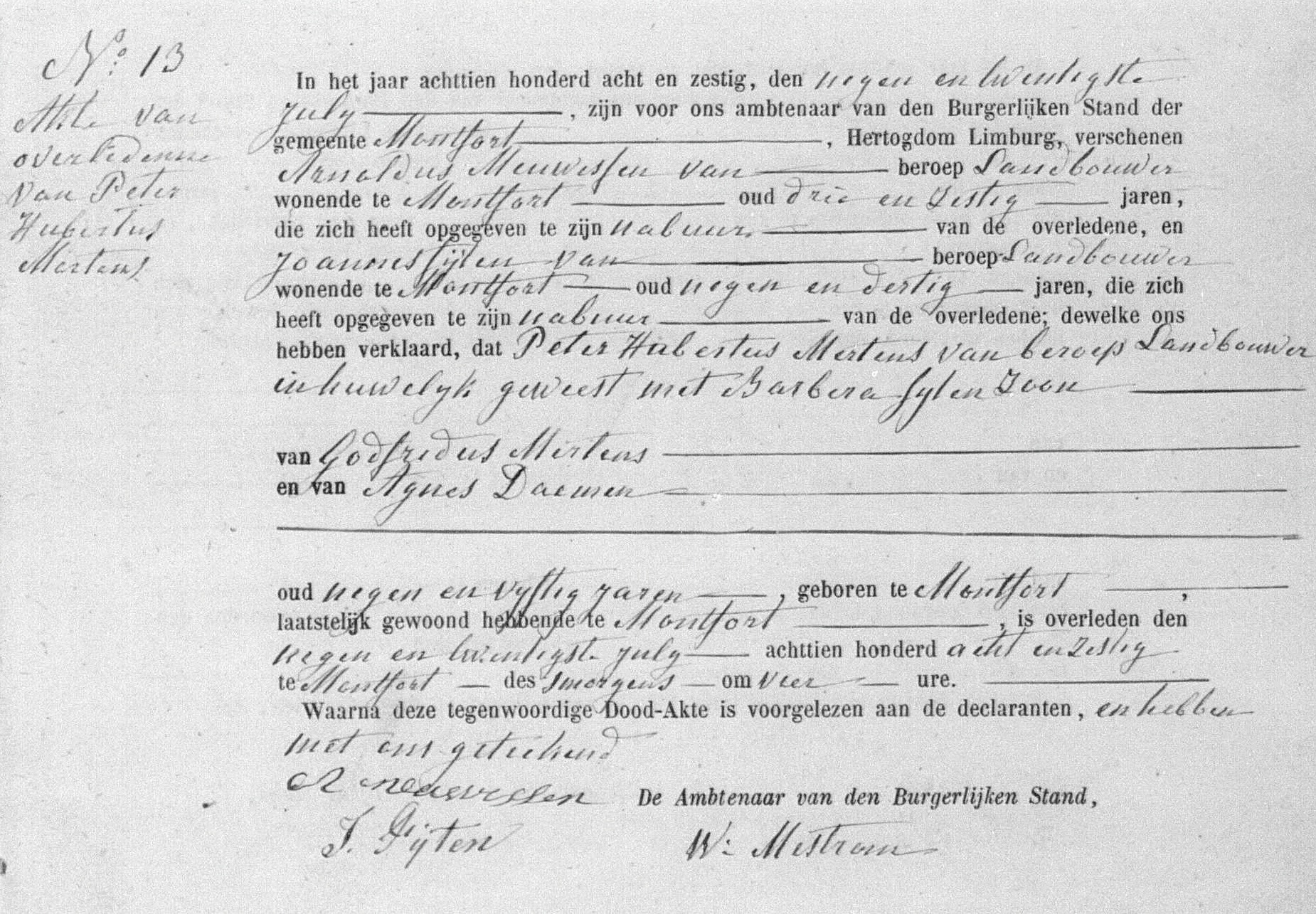 De overledene was 78 jaar oud, geboren en laatst woonachtig te Montfort, zonder beroep, weduwnaar van Joanna Zeelen en zoon van Godefridus Mertens en Margaretha Beeren. Het overlijden vond plaats om 09:00 uur.