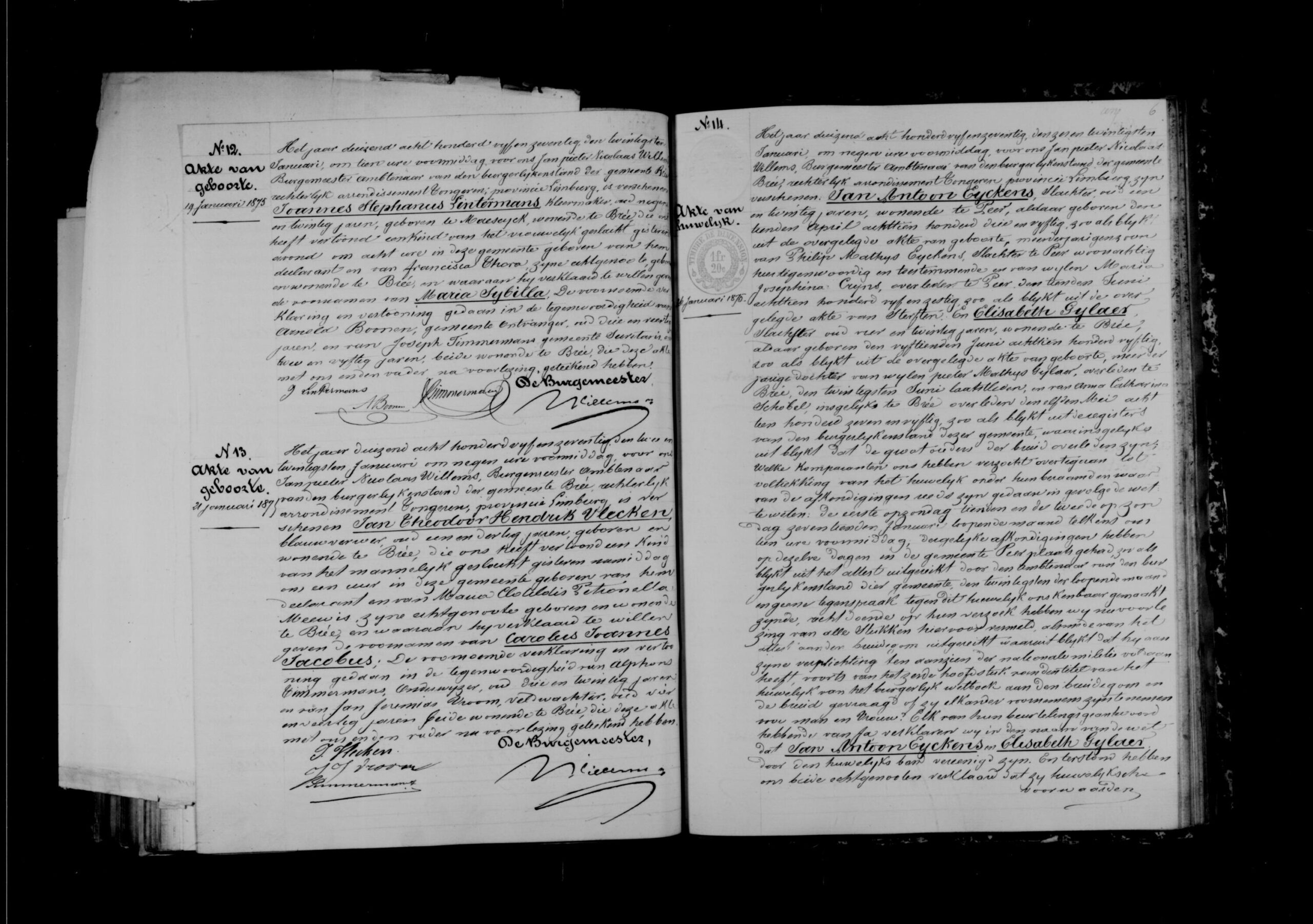 Getuigen: Arnold Boonen, 43 jaar oud, gemeenteontvanger uit Bree en Joseph Timmermans, 52 jaar oud, gemeentesecretaris uit Bree.