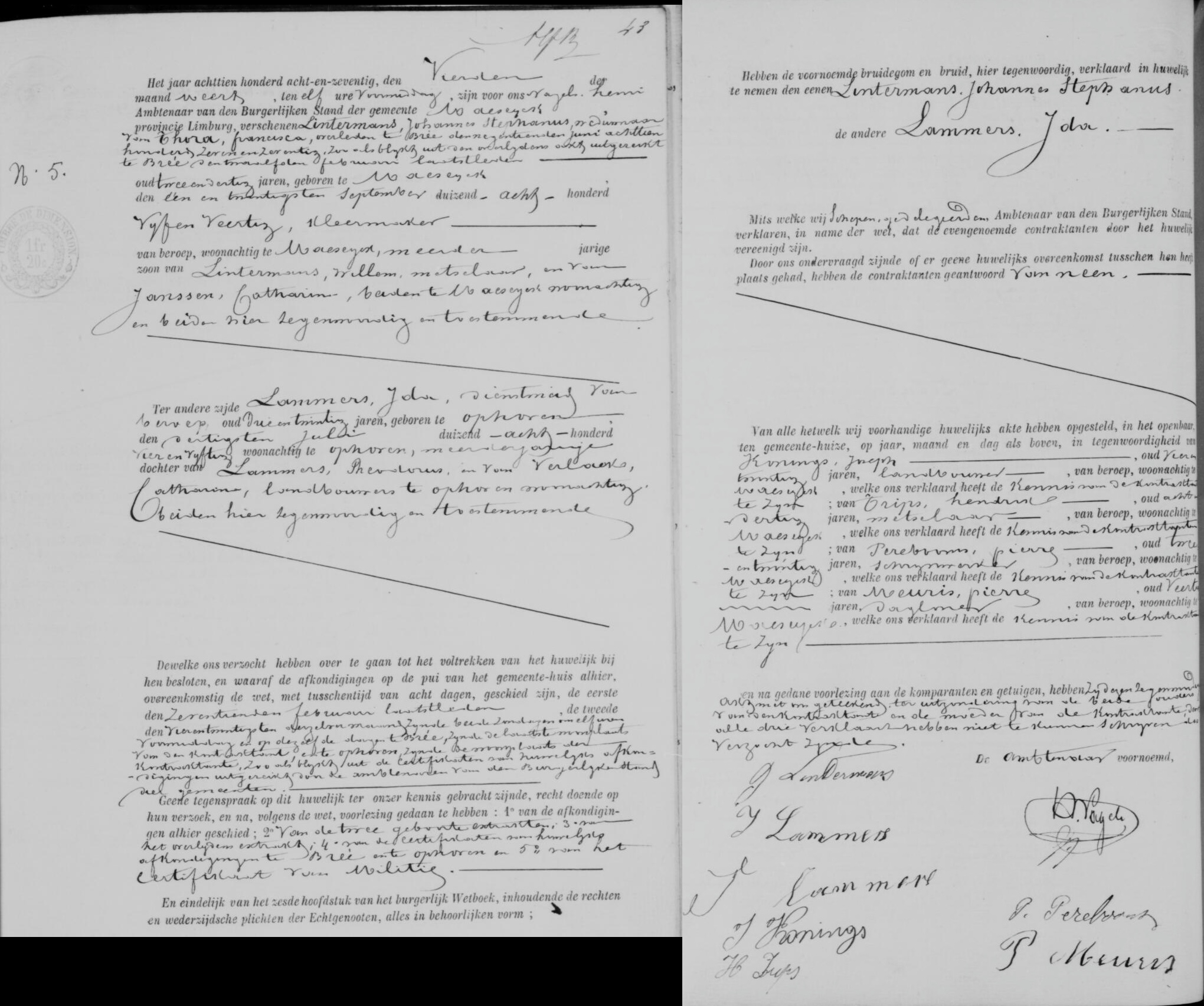 Getuigen: Joseph Konings, 24 jaar oud, landbouwer uit Maaseik en Hendrik Trips, 38 jaar oud, metselaar uit Maaseik en Pierre Perebooms, 22 jaar oud, schoenmaker uit Maaseik en Pierre Meuris, 40 jaar oud, dagloner uit Maaseik.