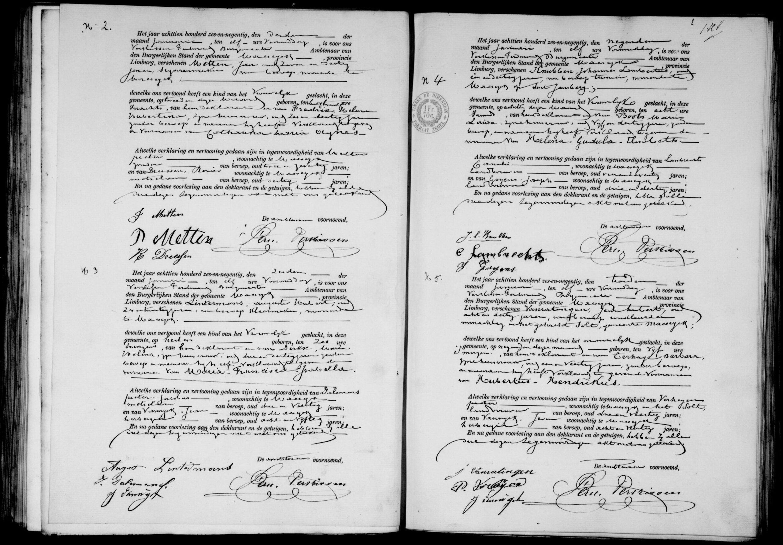 Getuigen: Pieter Jacobus Dalemans, 43 jaar oud, metselaar uit Maaseik en Jean Vanwijck, 58 jaar oud, herbergier uit Maaseik.