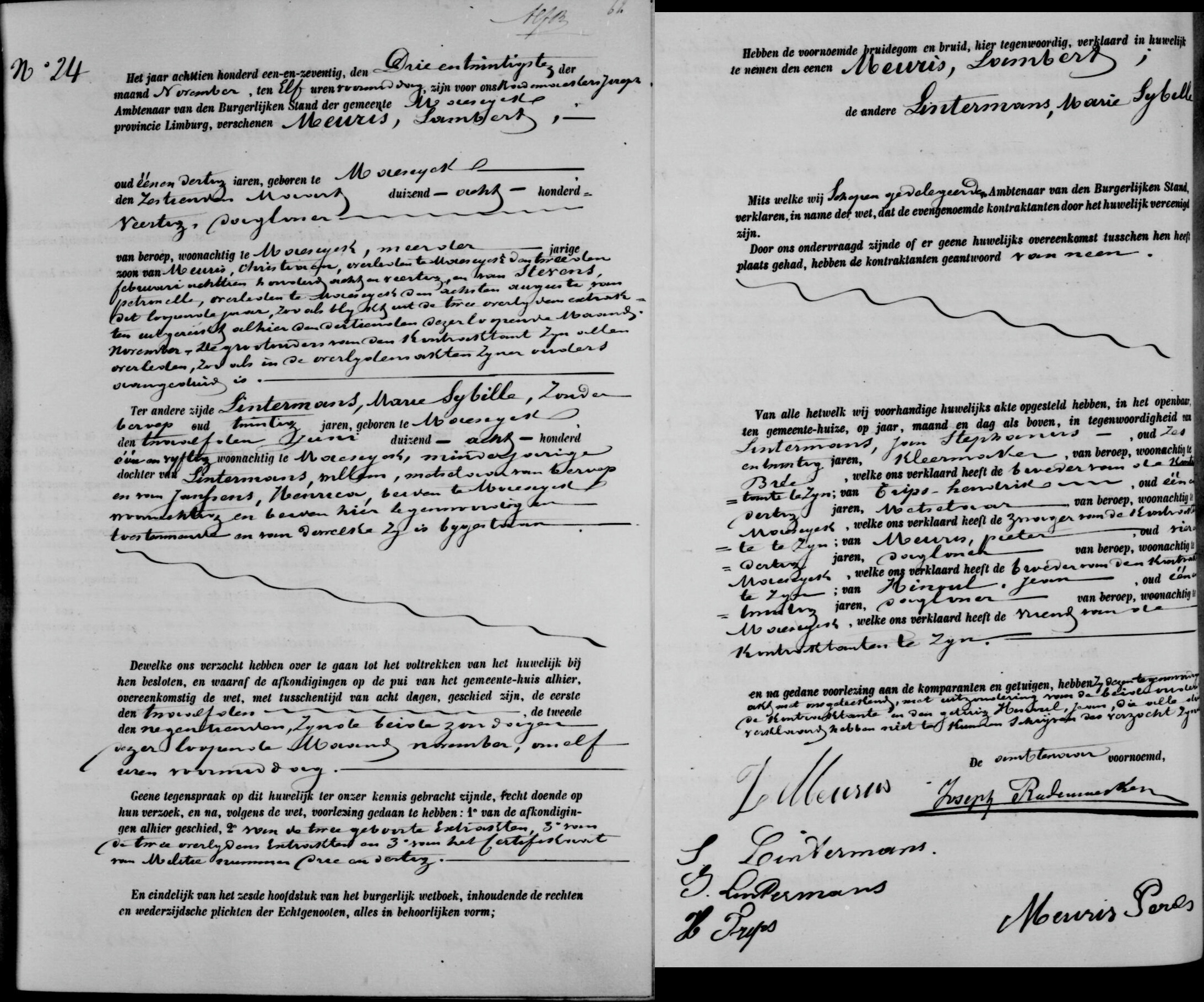 Getuigen: Joannes Stephanus Lintermans, 26 jaar oud, kleermaker uit Bree, broer van de bruid en Hendrik Trips, 41 jaar oud, metselaar uit Maaseik, zwager van de bruid en Pieter Meuris, 64 jaar oud, dagloner uit Maaseik, broer van de bruidegom en Jean Hinoul, 31 jaar oud, dagloner uit Maaseik, vriend van de echtgenoten.
