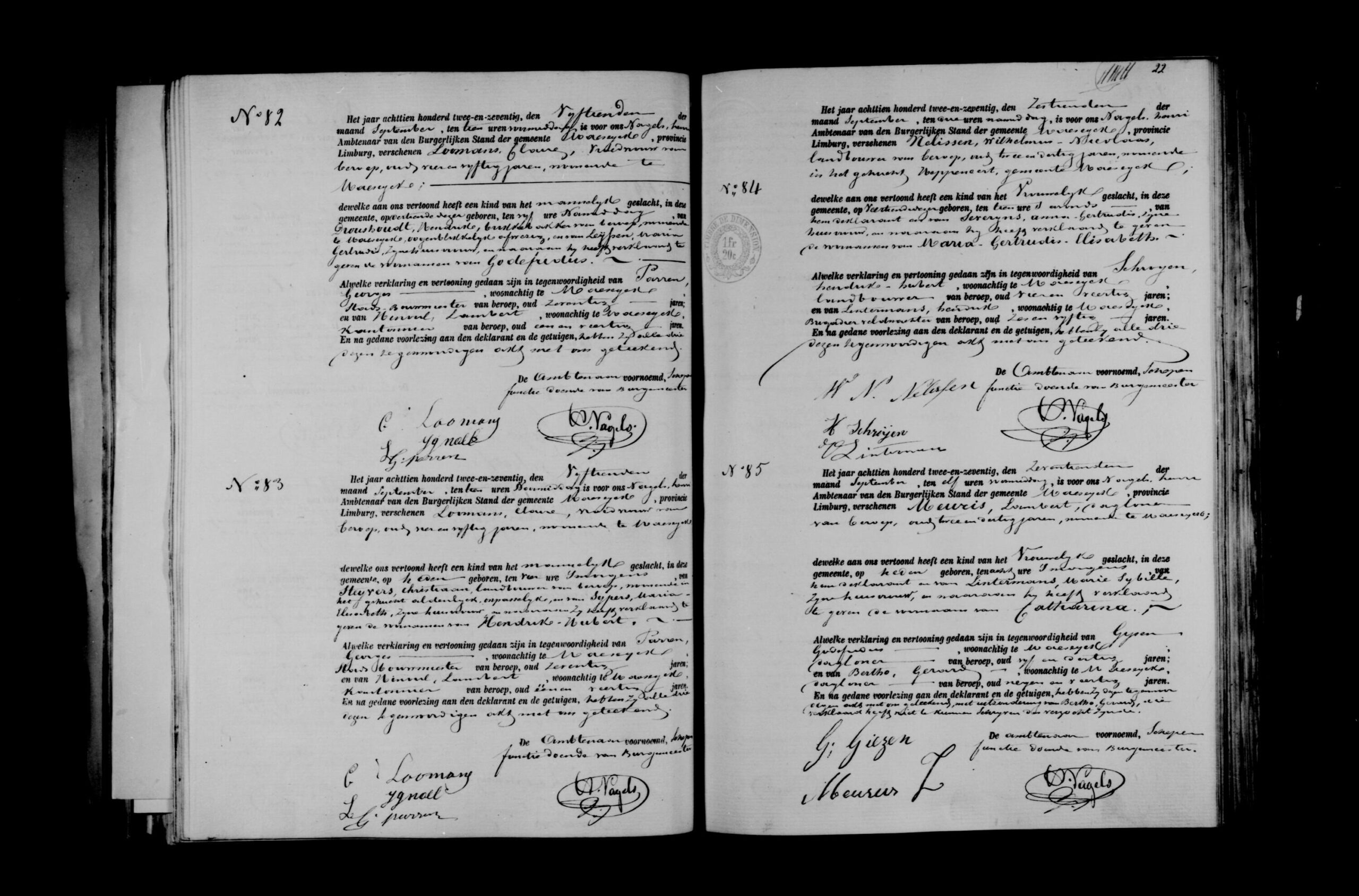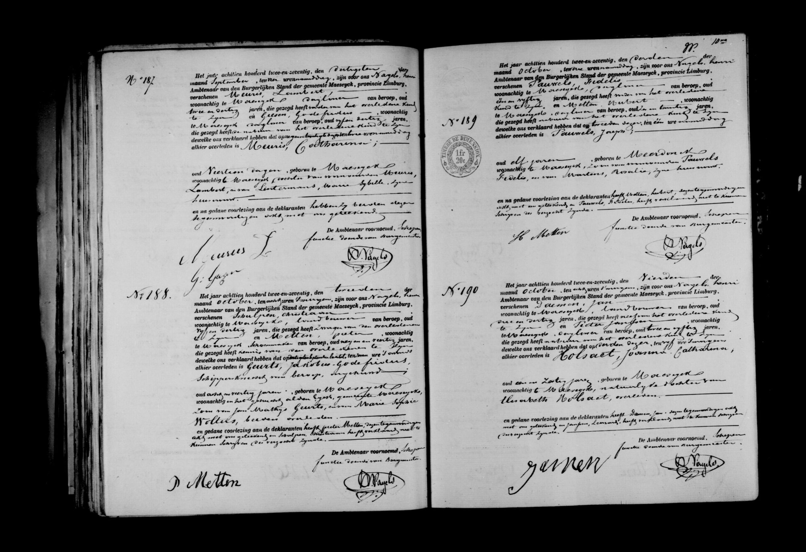 Getuigen: Godefridus Gysen, 35 jaar oud, dagloner uit Maaseik en Gerard Bertho, 49 jaar oud, dagloner uit Maaseik.