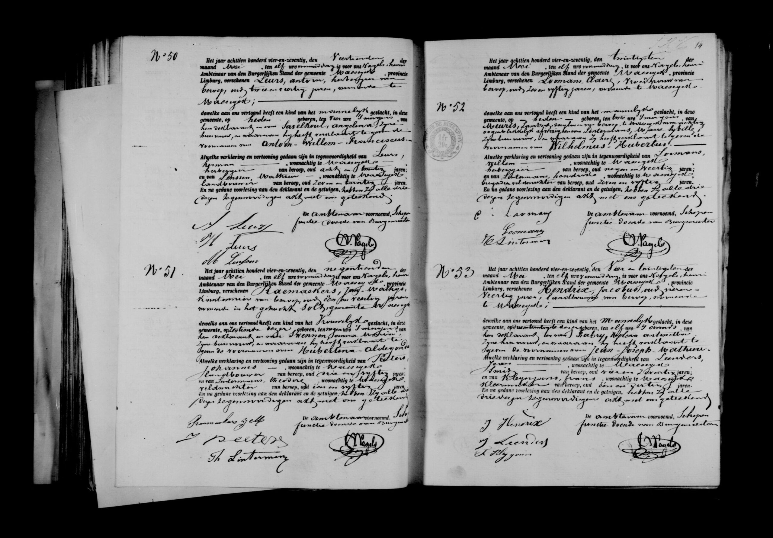 Getuigen: Willem Loomans, 49 jaar oud, herbergier uit Maaseik en Hendrik Lintermans, 57 jaar oud, brigadier veldwachter uit Maaseik, oudoom.