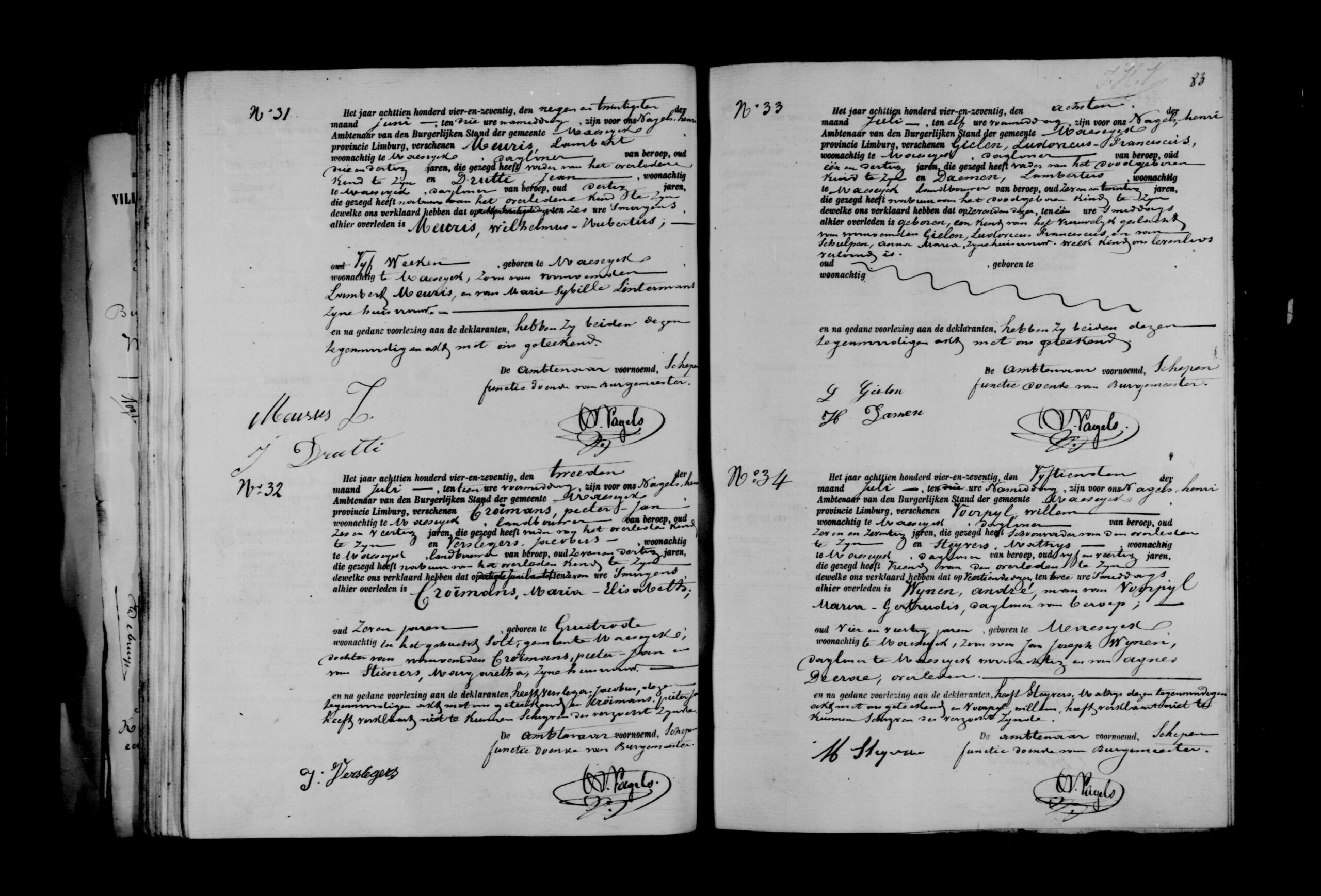 Aangevers: Lambert Meuris, 33 jaar oud, dagloner uit Maaseik, vader van de overledene en Jean Drutti, 30 jaar oud, dagloner uit Maaseik, buur.