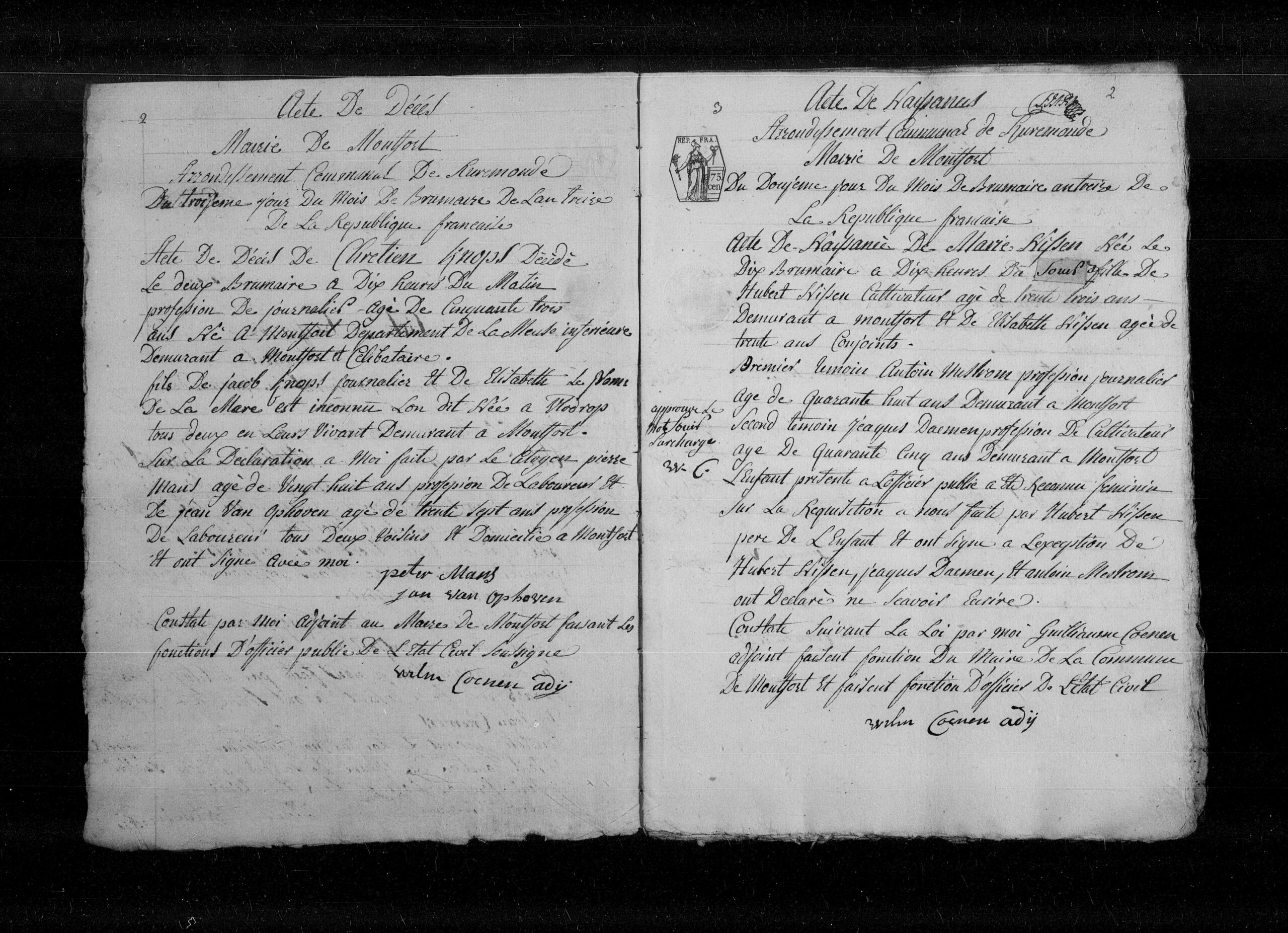 Vader en beide getuigen verklaarden niet te kunnen schrijven. De ambtenaar heeft in de marge een correctie/overschrijving van het woord 'Soir' (avond) goedgekeurd.
