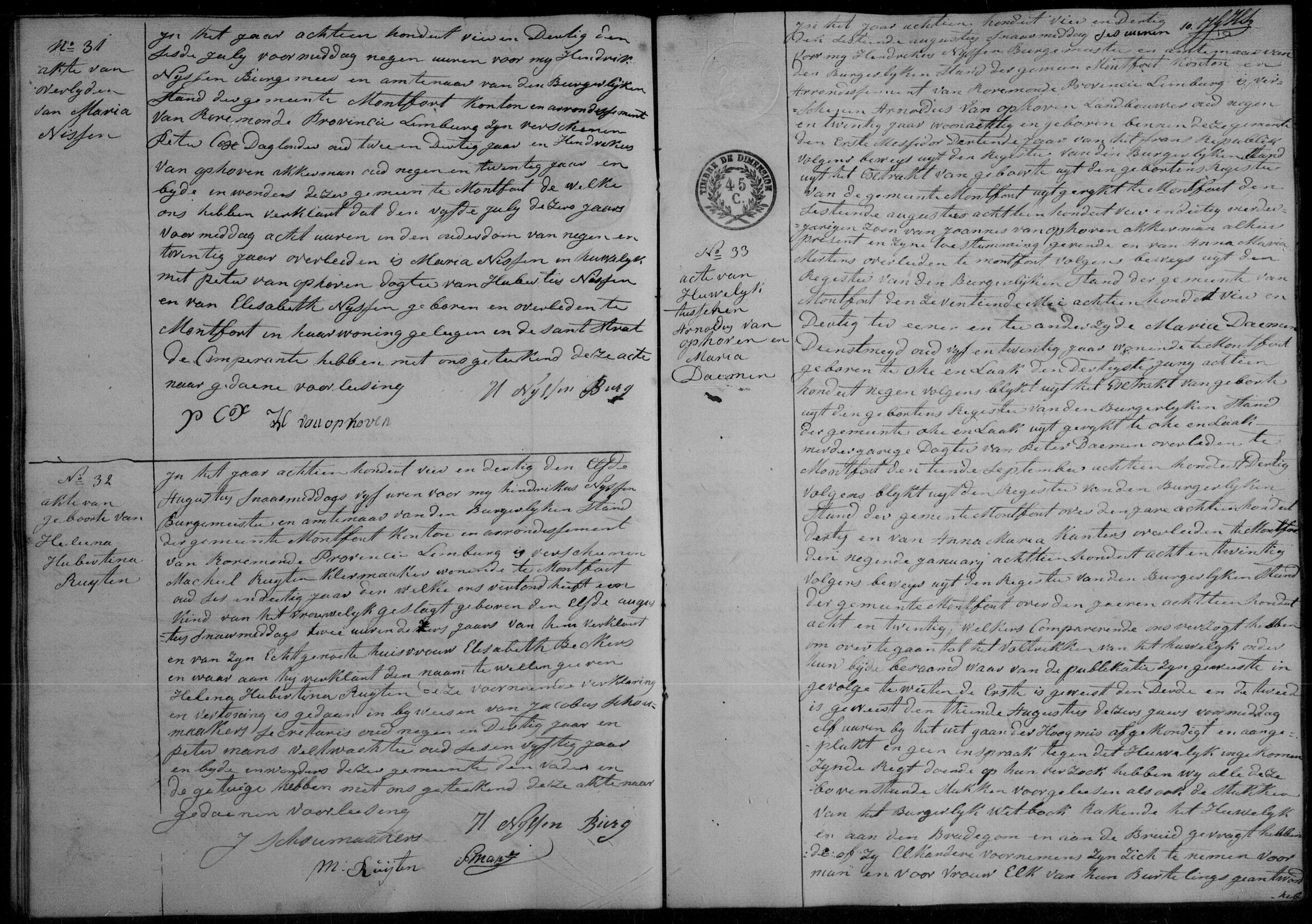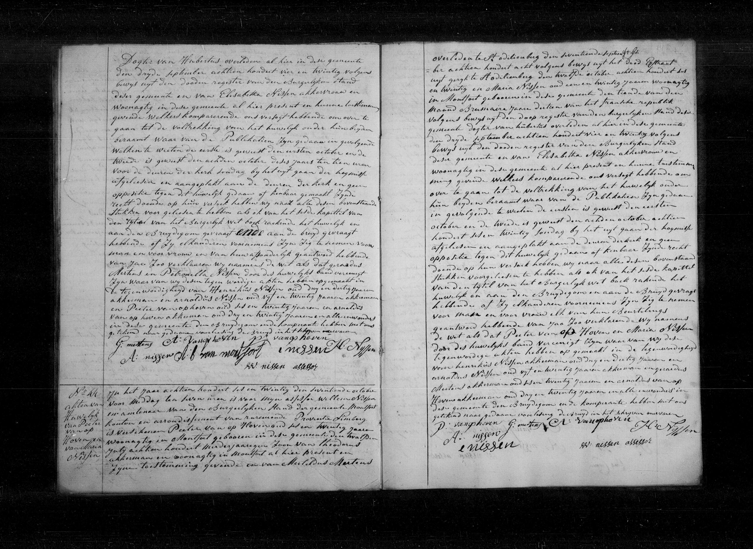 Bruidegom is geboren te Montfort op 12 juli 1800 als zoon van Theodorus van op Hoven (aanwezig) en Mechtildus Martens (overleden St. Odiliënberg 17 sept 1808). Bruid is geboren te Montfort op 10 Brumaire jaar 13 als dochter van Hubertus Nissen (overleden Montfort 3 sept 1824) en Elisabitha Nissen (aanwezig). De bruid verklaarde niet te kunnen schrijven.