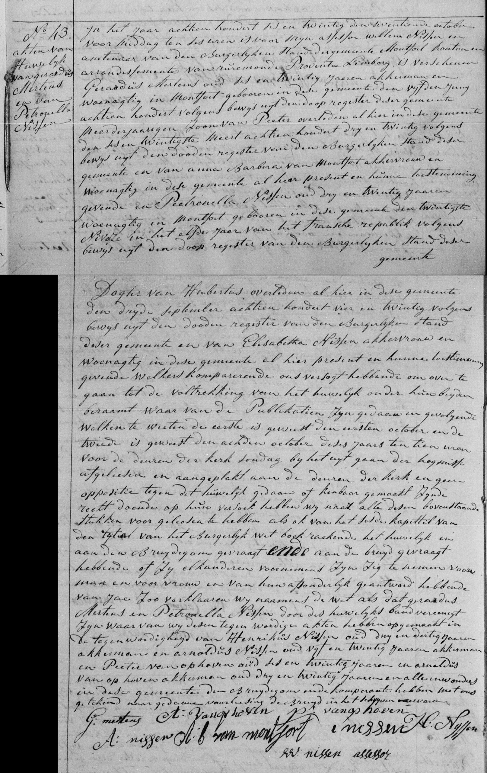 Getuigen: Henricus Nissen, 33 jaar oud, akkerman uit Montfort en Arnoldus Nissen, 25 jaar oud, akkerman uit Montfort en Peter van Ophoven, 26 jaar oud, uit Montfort en Arnoldus van Ophoven, 23 jaar oud, uit Montfort.