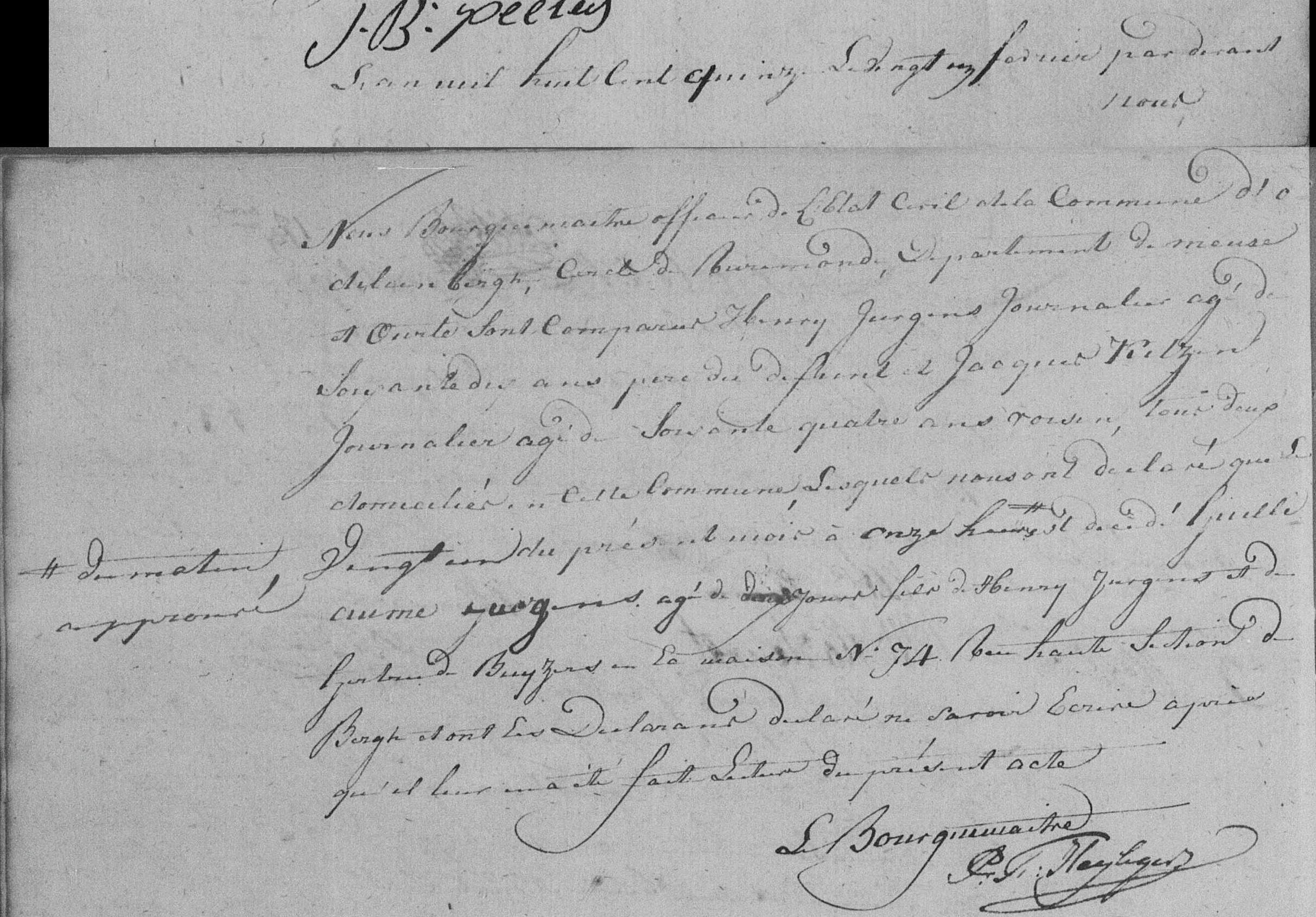 De overledene was 2 dagen oud ('deus Jours'). Hij is overleden op 21 februari 1815 om 11:00 uur 's morgens in huis nr. 74 aan de Hoogstraat ('Rue haute Section d. Bergh'). Vader en aangever Henry Jurgens werd genoteerd met een leeftijd van 70 jaar. Beide aangevers verklaarden niet te kunnen schrijven.