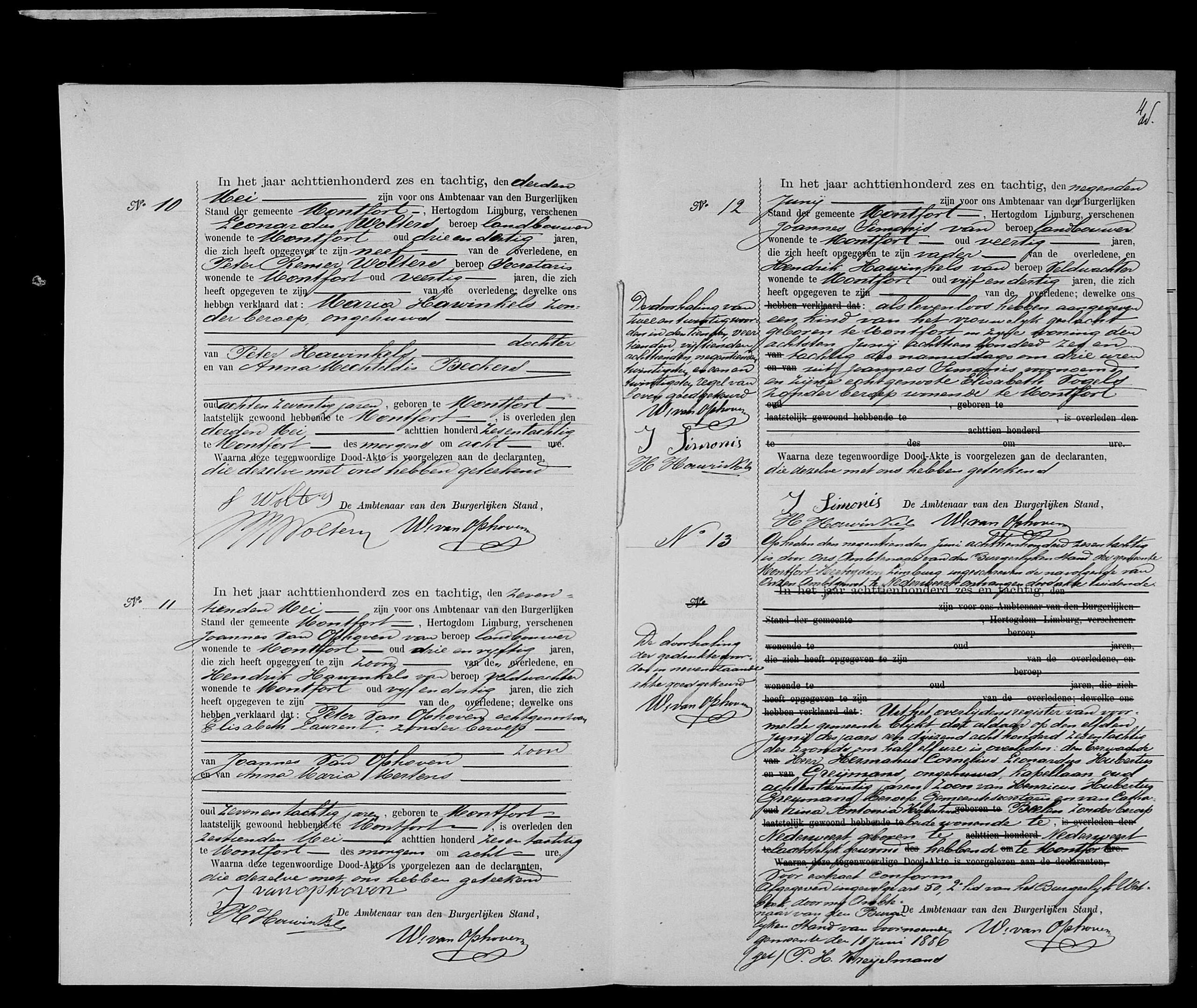 - Aangevers: Joannes van Ophoven, van beroep landbouwer, wonende te Montfort, oud drieënvijftig jaren, die zich heeft opgegeven te zijn zoon van de overledene, en Hendrik Hawinkels, van beroep veldwachter ,wonende te Montfort, oud vijfendertig jaren
