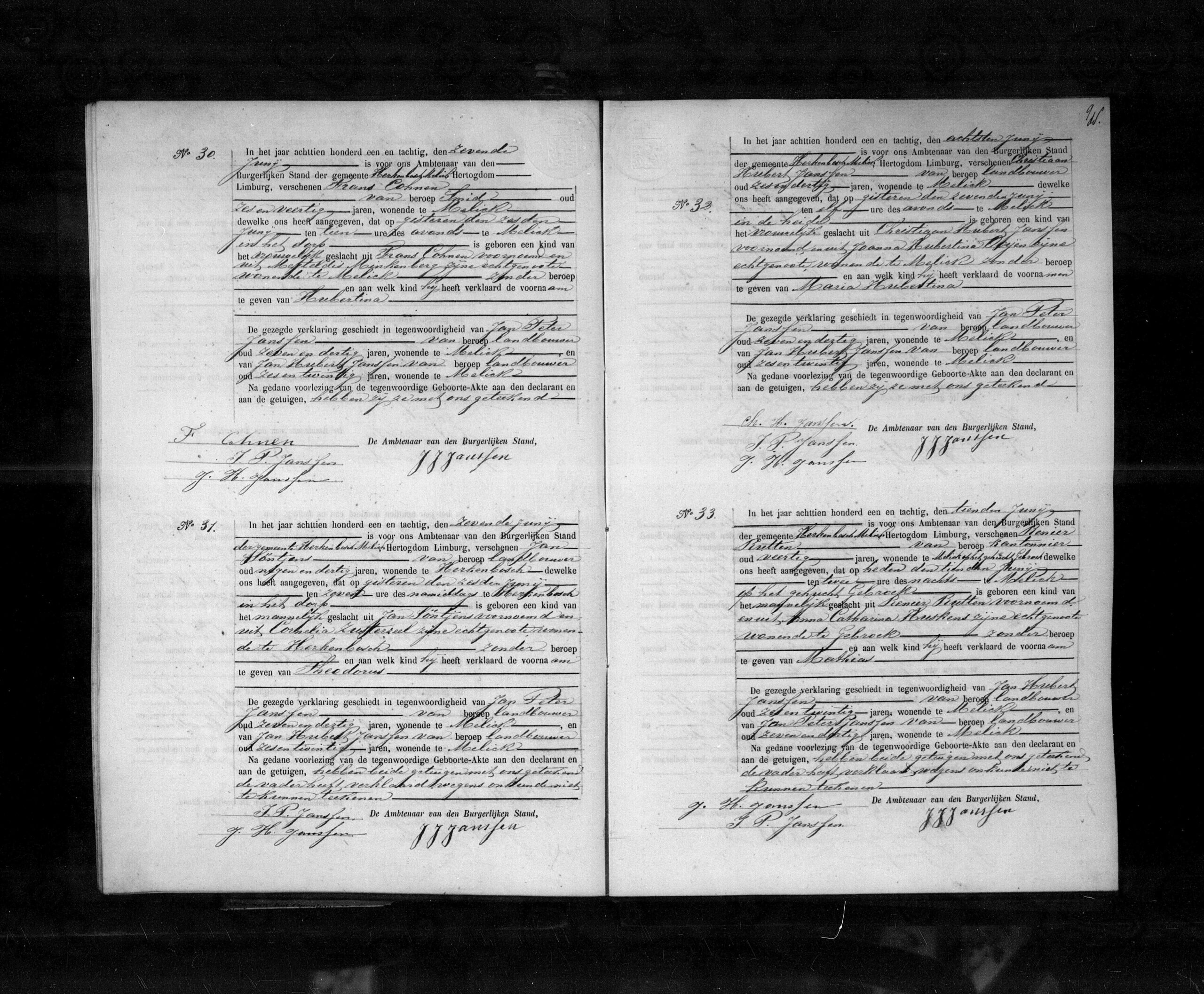 Geboren om zeven uur in de namiddag in het dorp te Herkenbosch. De moeder is zonder beroep. De vader heeft verklaard wegens onkunde niet te kunnen tekenen.