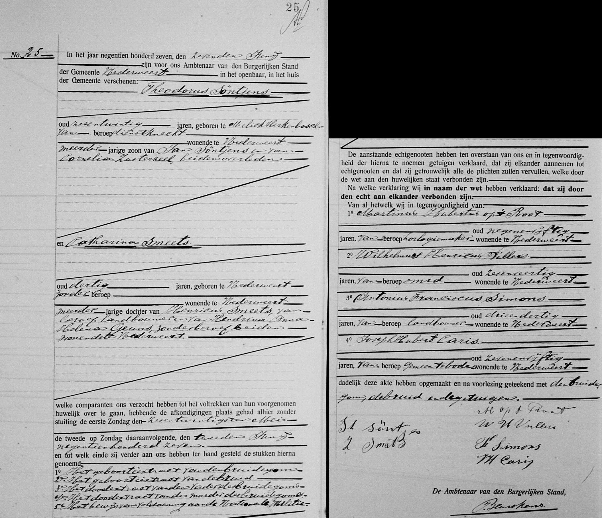 De bruidegom is 26 jaar oud, geboren te Melick Herkenbosch, van beroep dienstknecht en wonende te Nederweert. Zijn ouders, Jan Söntjens en Cornelia Zusterzeel, zijn beiden overleden. De bruid is 30 jaar oud, geboren te Nederweert, zonder beroep en wonende te Nederweert. Haar ouders zijn Henricus Smeets (landbouwer) en Hendrina Anna Helena Geuns (zonder beroep), beiden wonende te Nederweert. De huwelijksafkondigingen vonden plaats op 26 mei en 2 juni 1907. De bruidegom heeft een bewijs van voldoening aan de Nationale Militie overlegd.
