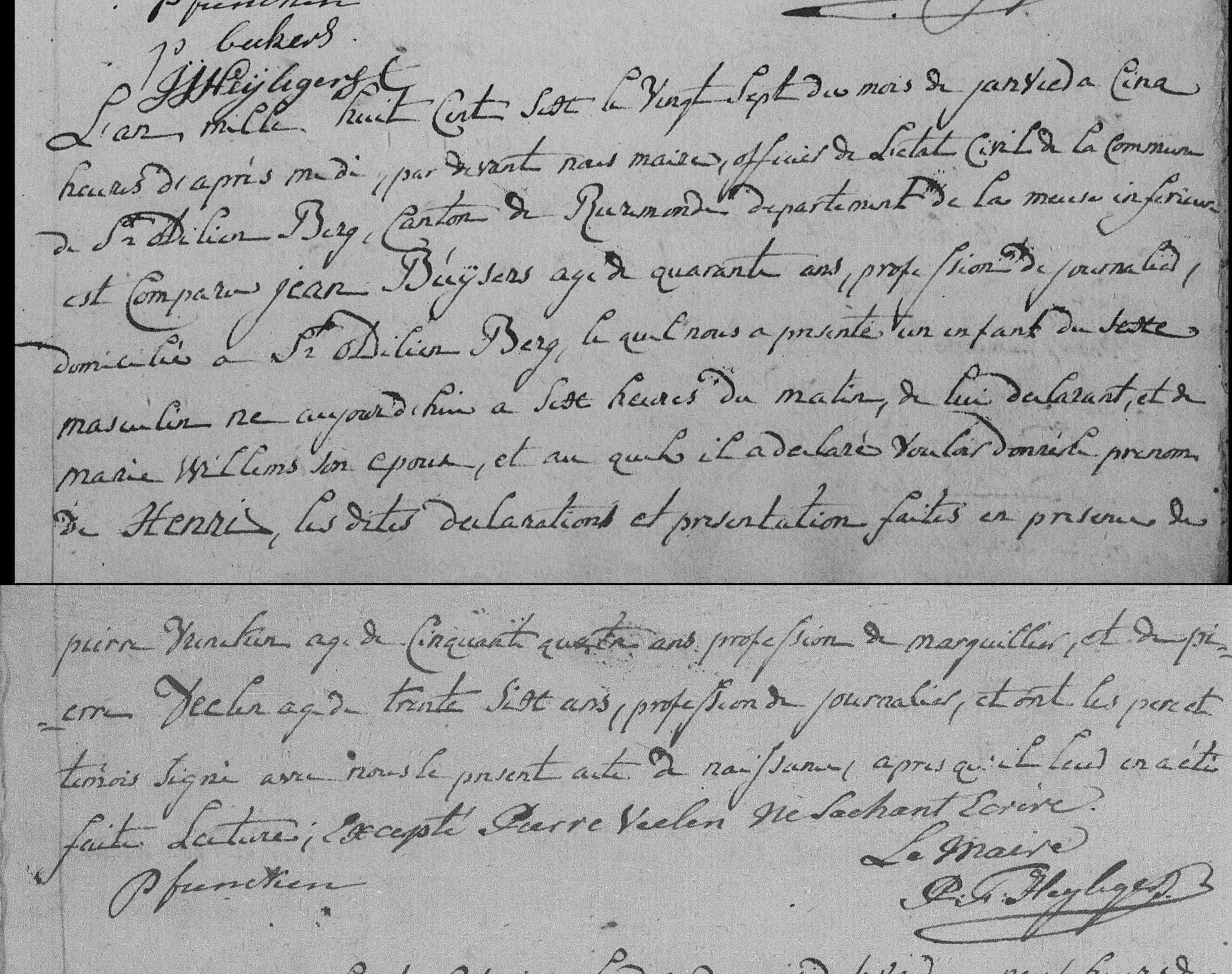 Geboren om zes uur in de ochtend. De akte is in het Frans opgesteld. De vader is 40 jaar oud en dagloner. De getuige Pierre Becker kan niet schrijven.