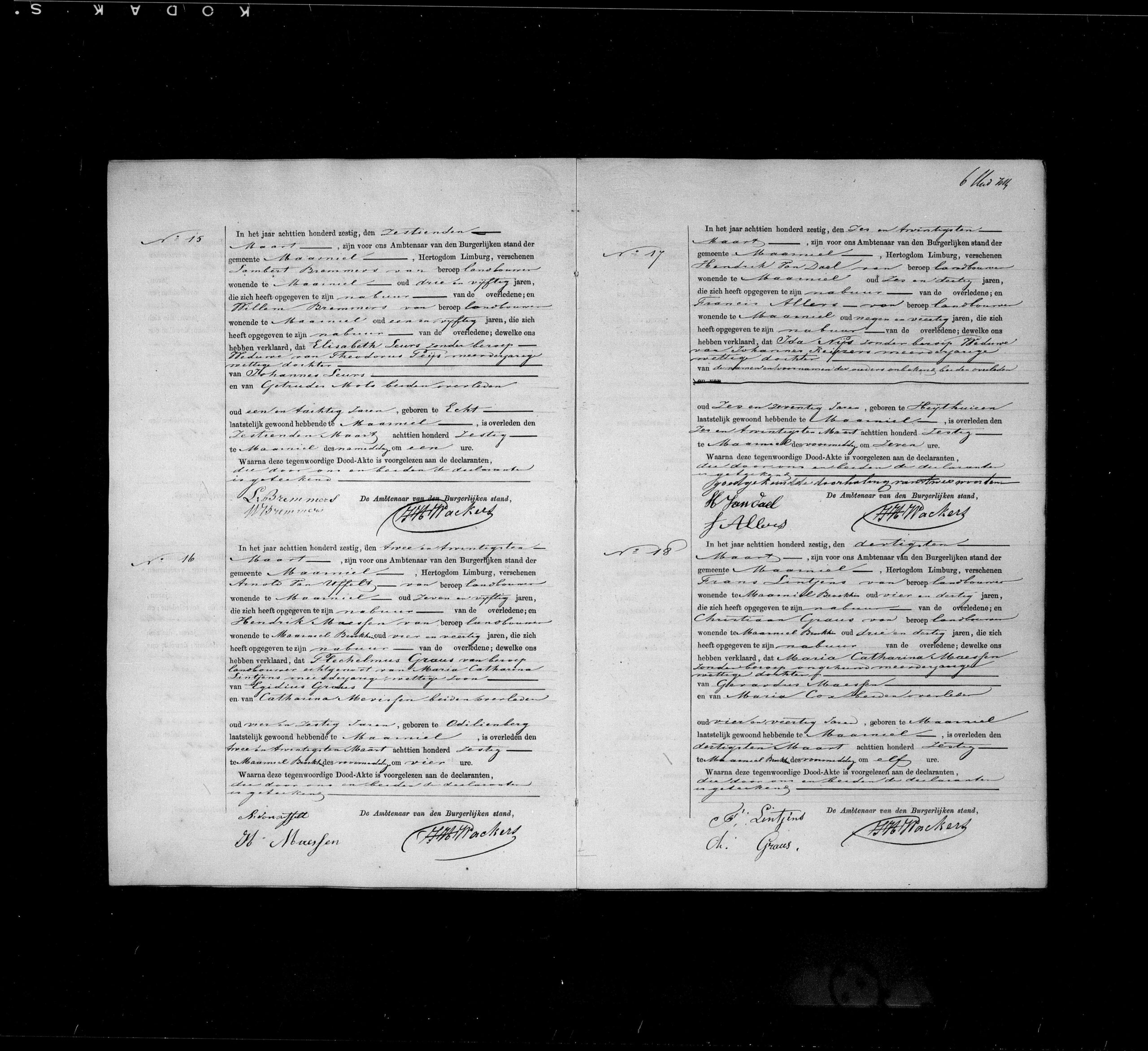 Overleden des voormiddags om vier uur te Maasniel in het gehucht Boukoul. De overledene was 64 jaar oud, van beroep landbouwer, geboren te Sint Odiliënberg, echtgenoot van Maria Catharina Lintjens, en meerderjarige wettige zoon van de overleden echtelieden Egidius Graus en Catharina Mevissen.