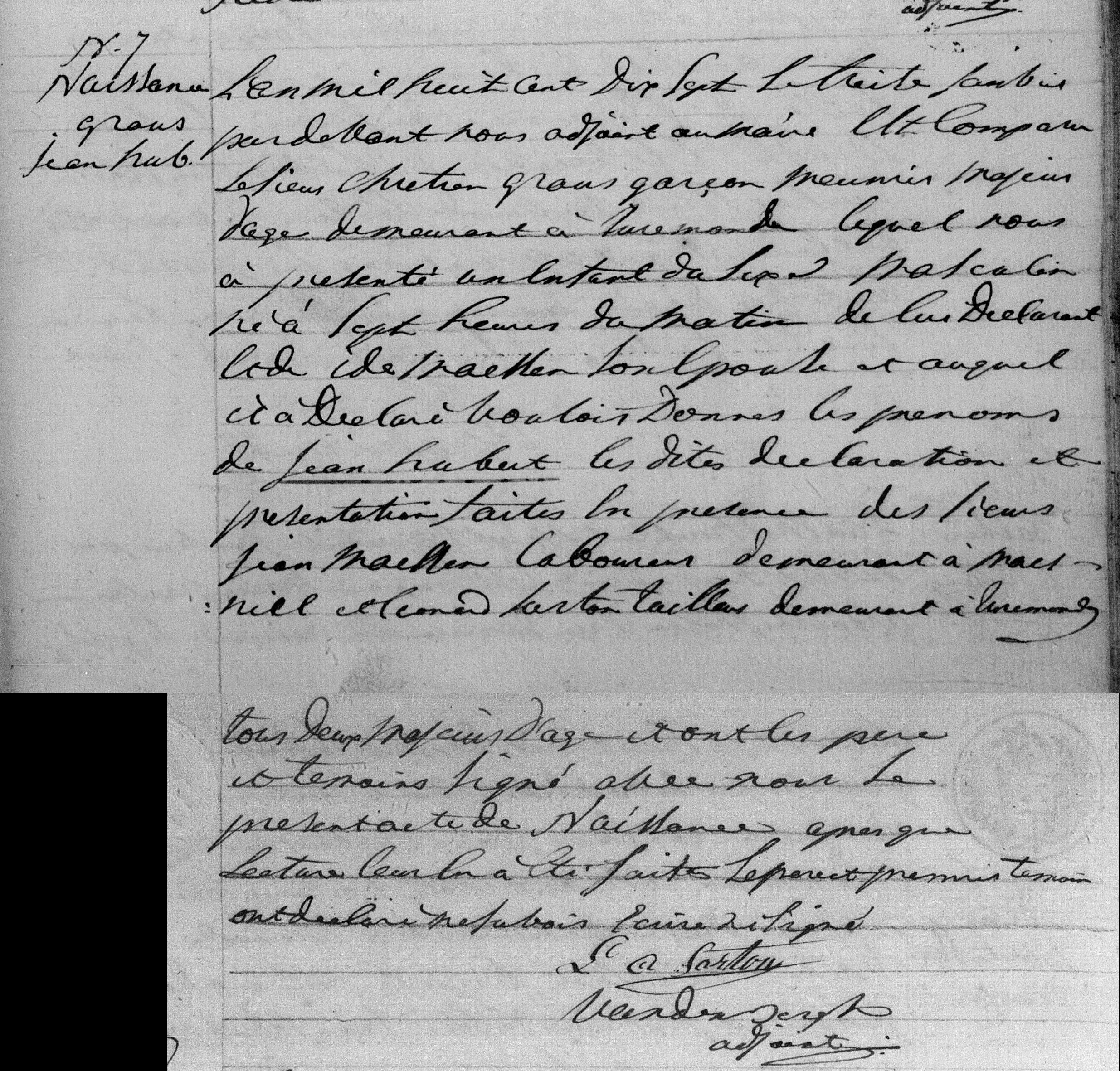 Het kind is geboren om zeven uur in de ochtend. De moeder, Ide Maessen, is de echtgenote van de aangever. De vader en de eerste getuige (Jean Maessen) hebben verklaard niet te kunnen schrijven of tekenen. De akte is opgemaakt door adjunct-burgemeester Vandenbergh.