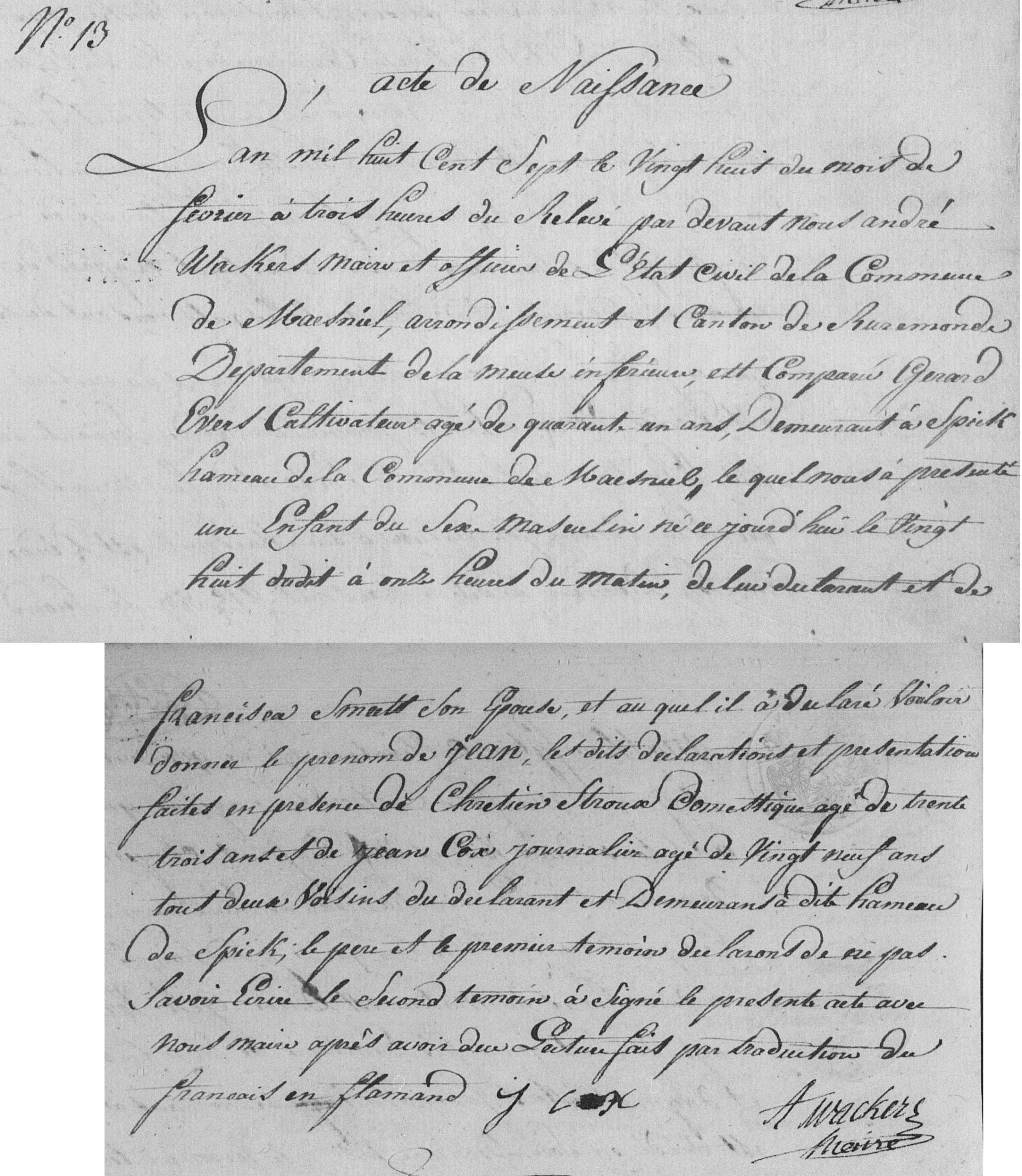 Het kind Jean is geboren om elf uur in de ochtend in het gehucht Spik. De moeder is Francisca Smeets, echtgenote van de aangever. De akte is voor de partijen door de burgemeester vertaald van het Frans naar het Vlaams (Nederlands). De vader en de eerste getuige verklaarden niet te kunnen schrijven.
