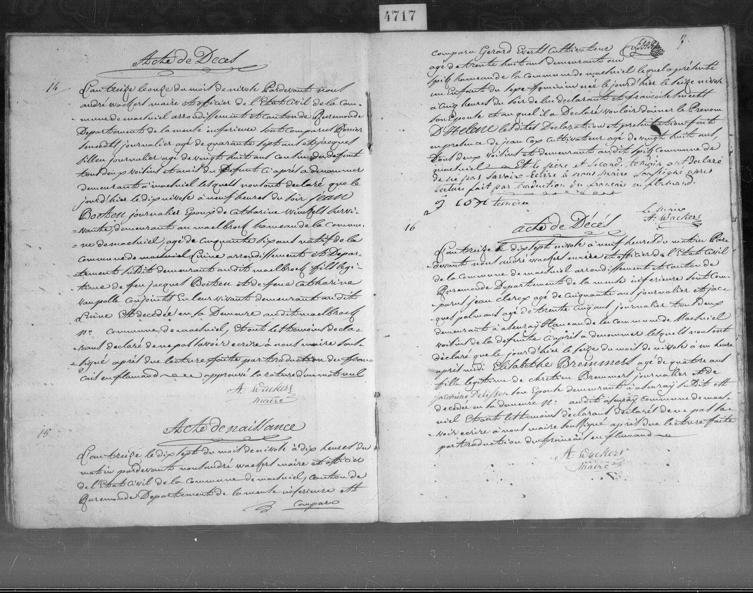 Het kind Helène is geboren op 16 Nivôse Jaar 13 (6 januari 1805) om vijf uur 's avonds in het gehucht Spik (Spick). De moeder is Francoise Smeets, echtgenote van de aangever. De akte is opgemaakt op 17 Nivôse Jaar 13 (7 januari 1805). De vader en een tweede (niet bij naam genoemde) getuige verklaarden niet te kunnen schrijven. De akte is door de burgemeester vertaald van het Frans naar het Vlaams voor de betrokkenen.