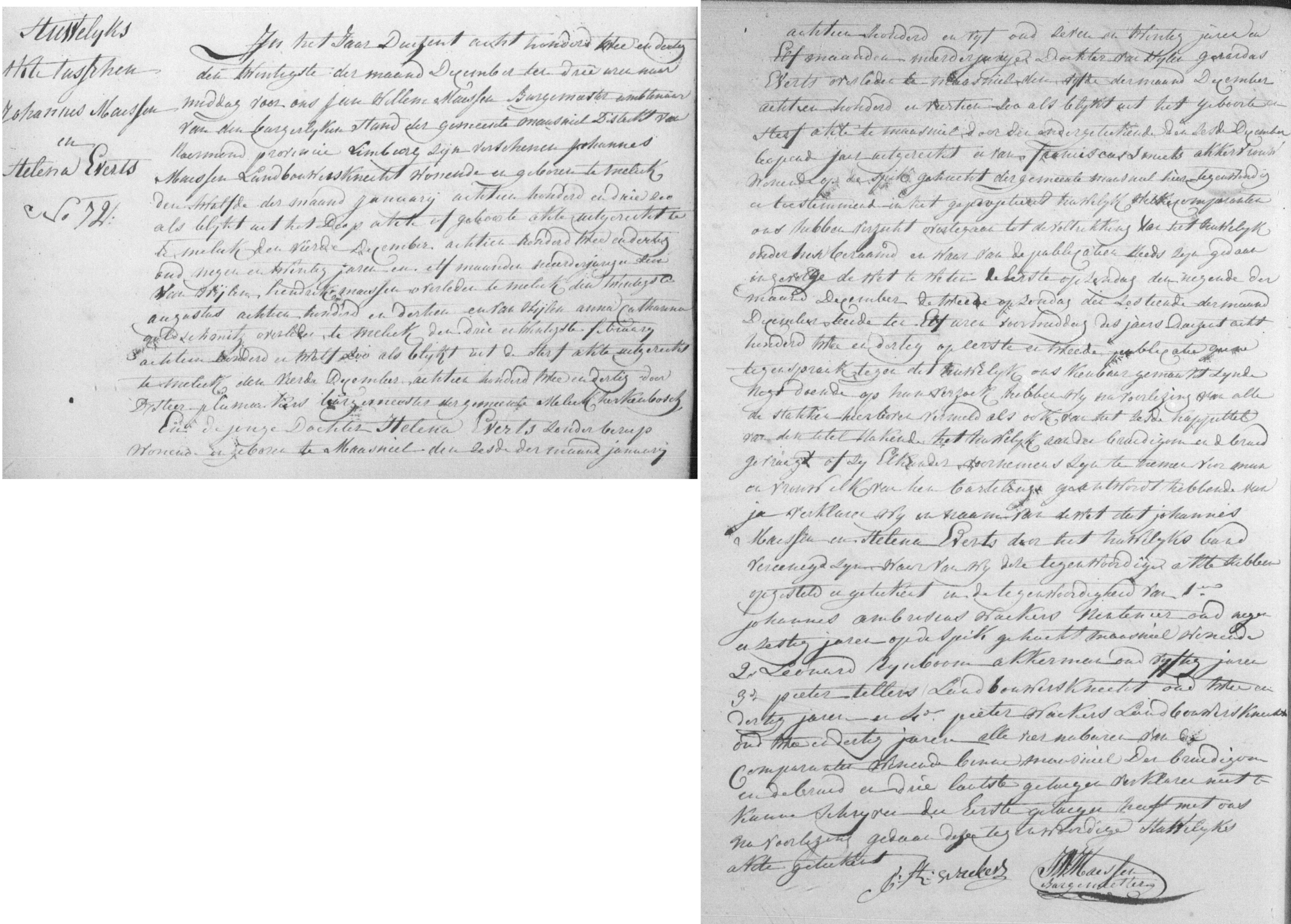 Bruidegom: Johannes Maessen (29 jaar, landbouwersknecht), geboren te Melick op 12-01-1803, zoon van wijlen Hendrik Maessen (overl. 20-08-1813) en wijlen Anna Catharina Schonitz (overl. 23-02-1812). Bruid: Helena Everts (27 jaar, zonder beroep), geboren te Maasniel op 06-01-1805, dochter van wijlen Gerardus Everts (overl. 05-12-1814) en Francisca Smeets (akkersvrouw, wonende te Spik, aanwezig en toestemmend). De bruidegom, de bruid en drie getuigen verklaarden niet te kunnen schrijven.