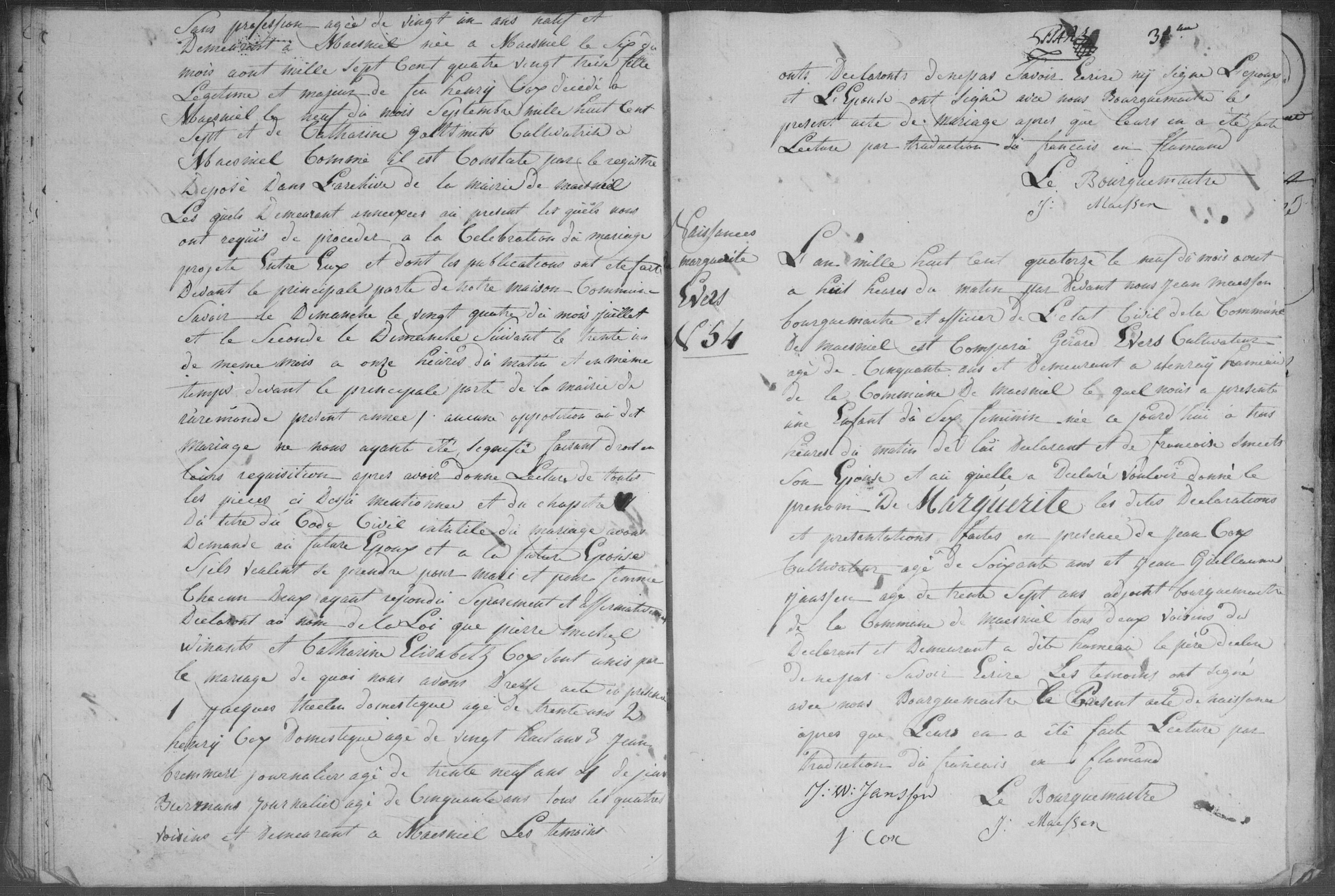Marguerite Evers is geboren op 9 augustus 1814 om drie uur in de ochtend in het gehucht Asenray (gemeente Maasniel). De moeder van het kind is Francoise Smeets (echtgenote van de aangever). De aangifte werd gedaan om acht uur in de ochtend. De vader verklaarde niet te kunnen schrijven. De akte is voorgelezen met een vertaling van het Frans naar het Vlaams.