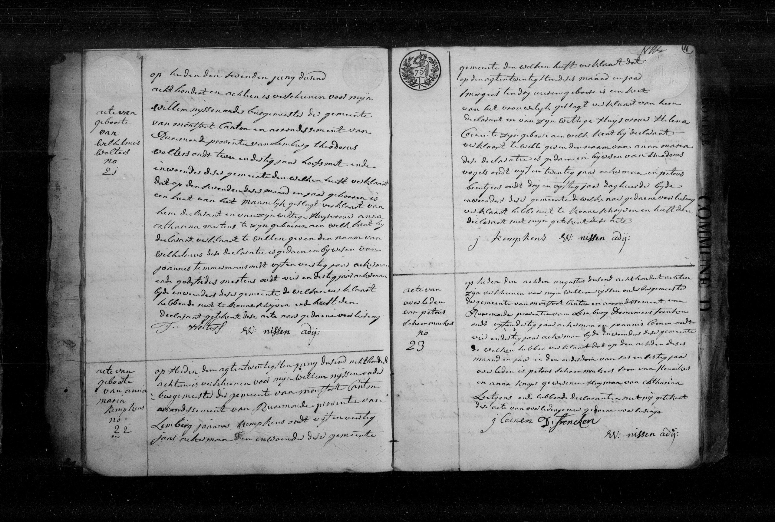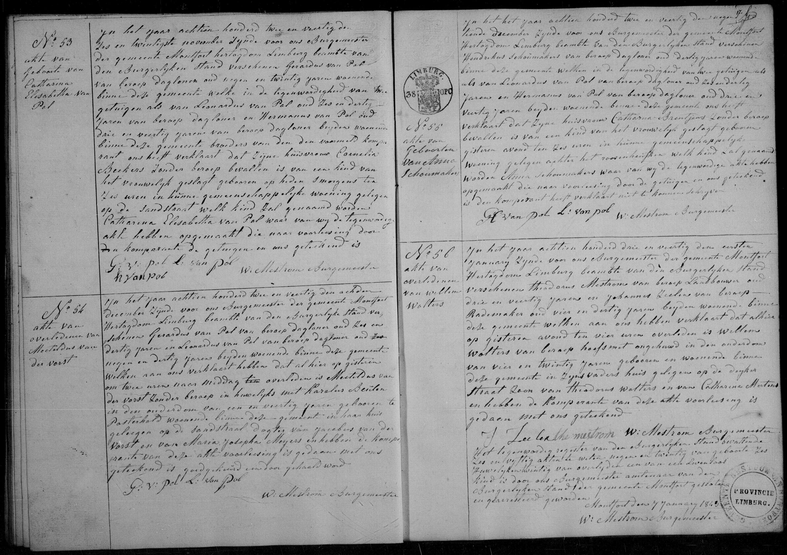 Aangever is de vader, Theodorus Wolters, 32 jaar oud, hoefsmid, wonende te Montfort. De moeder is zijn wettige huisvrouw Catharina Mertens. De getuigen zijn Joannes Timmermans, 45 jaar, en Godefridus Musters, 64 jaar, beiden wonende te Montfort. De akte is opgemaakt door Willem Nijssen, onder-burgemeester.