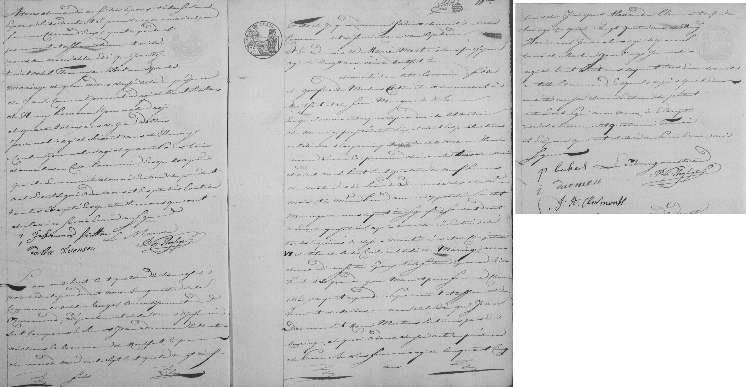 De bruidegom is Jean Daemen, landbouwer, geboren te Montfort op 1 mei 1789, zoon van Jaques Daemen (dagloner, wonende in deze gemeente) en wijlen Marie van Ophoven. De bruid is Marie Mertens, 20 jaar oud, wonende in deze gemeente, dochter van Godefroid Mertens (landbouwer, wonende te Montfort) en wijlen Marguerite Coenen. De bruid en de vierde getuige verklaarden niet te kunnen schrijven of tekenen.
