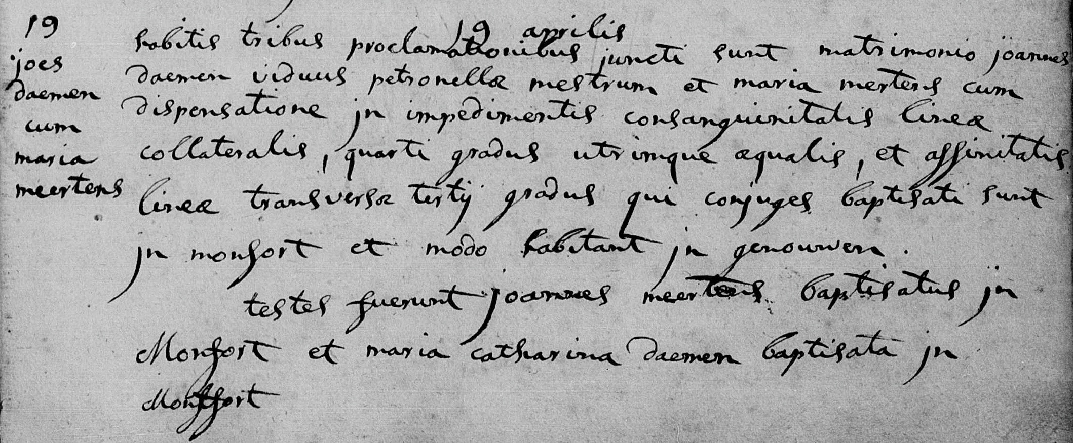 De bruidegom is weduwnaar van Petronella Mestrum. Beide echtelieden zijn gedoopt in Montfort en wonen momenteel in het gehucht Genouwen. Er is dispensatie verleend voor bloedverwantschap in de zijlijn in de vierde graad (aan beide zijden gelijk) en voor aanverwantschap in de zijlijn in de derde graad. Beide getuigen zijn eveneens gedoopt in Montfort.