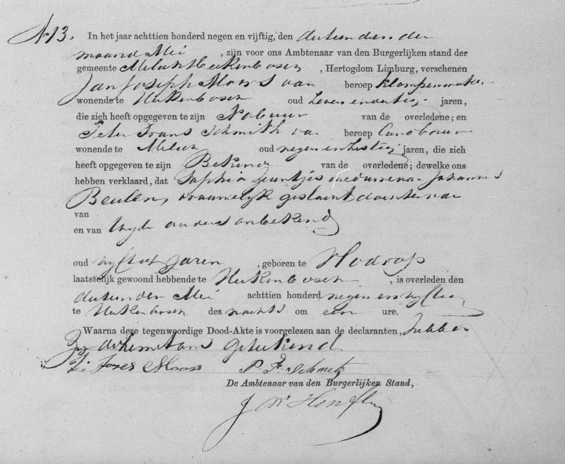 Aangevers: Jan Joseph Moors, 37 jaar oud, klompenmaker uit Herkenbosch, buurman en Peter Frans Schmith, 69 jaar oud, landbouwer uit Melick, bekende.