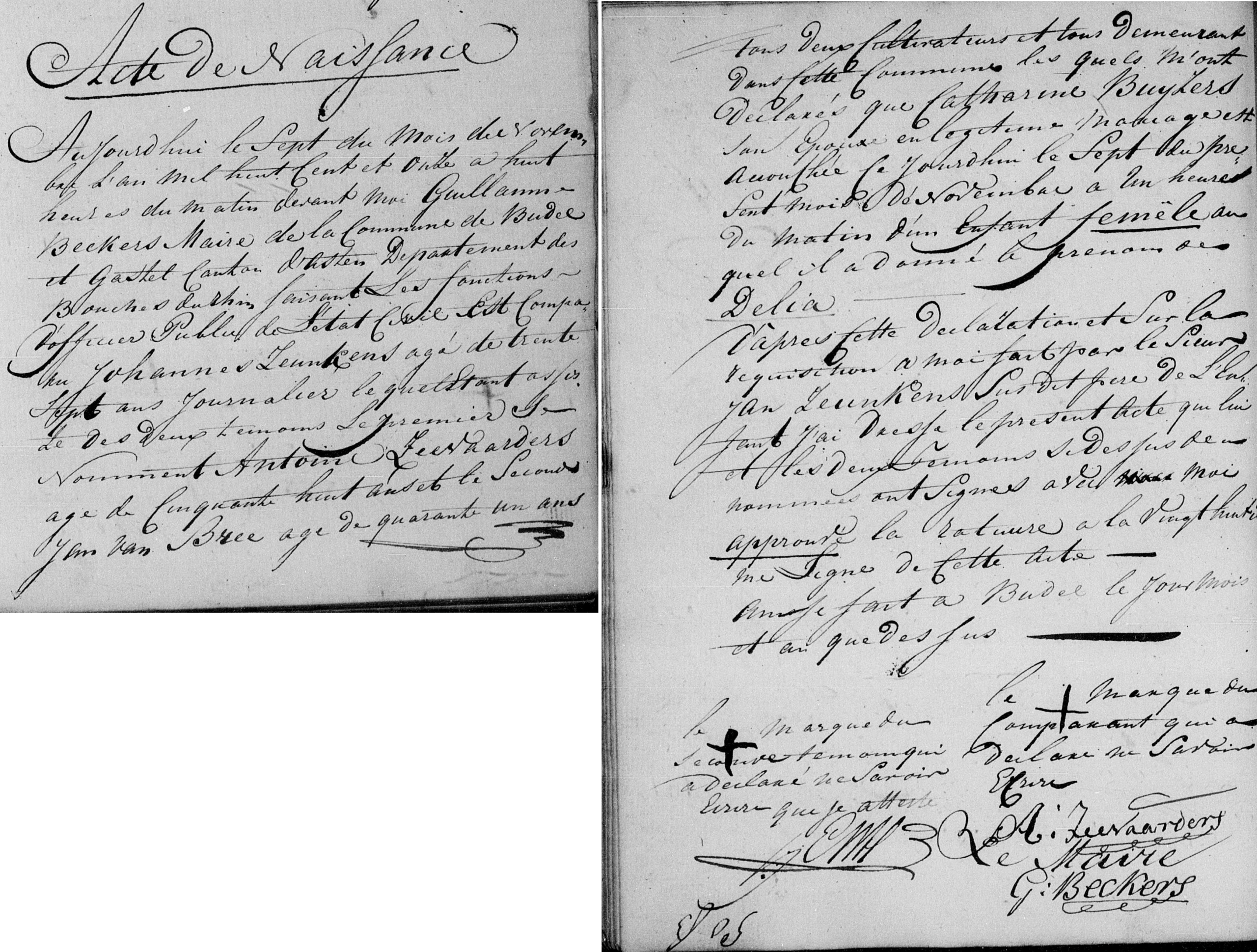 Op heden den dertienden April achttien honderd acht en twintig ten acht uren voormiddag, verscheen voor ons Jan Moubis Burgemeester der Gemeente Vlodrop, Distrikt Roermond, Provincie Limburg, Jan Marks daglooner wonende te Vlodrop mij te kennen gevende als dat zijne schoonzuster Anna Maria Delissen weduwe Ruth Marks dagloonersche wonende alhier te Vlodrop op den gisteren den twaalfden dezer namiddags ten vijf uren, dat zij zijnde in een naburig huis bij Ruth van der beek, haar kind in haar huis hoorende schreeuwen, dat zij naar huis ging, gezien hebbende dat dit kind geslagen wierd door Christiaan Seuntjens oud twaalf jaren dewelke zij daar in huis wezen de waar op de voornoemde Anna Maria Delissen hem met eene hand aan zijn hoofd heeft geslagen waarop de Moeder Catharina Busers, weduwe van Jan Seuntjens met hare dochter Helena oud zeventien jaren, alwoonende in het zelve huis, de Moeder gewapend zijnde met eene heep in de hand, de dochter gewapend met eene graafschup en hare voornoemde zoon met een mes, waarop de voornoemde Katharina Busers met de heep Anna Maria Delissen verscheide slagen heeft toegebragt met hare twee voormelde kinderen waarop zij de vlugt heeft genomen buiten het huis des waar naemden Christiaan Seuntjens eene graafschup genomen heeft dezelve daarmede voor haar hoofd in geslagen wonde heeft gezien Andreas Van Der Beek jong man oud zeventien jaren dienstknecht wonende te Vlodrop bij Peter Piskens akkerman.