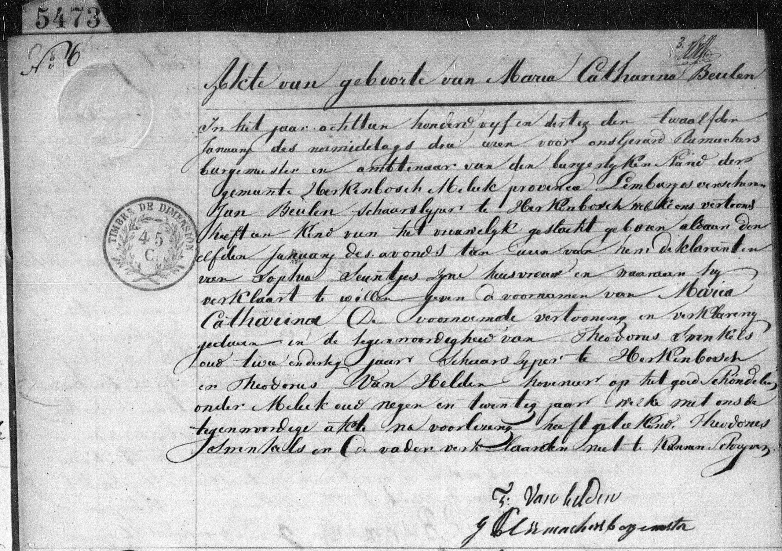 De geboorte vond plaats op 11 januari om 22:00 uur. De moeder is Sophia Seuntjes, echtgenote van de aangever. De vader en de eerste getuige verklaarden niet te kunnen schrijven. De tweede getuige is hovenier op het goed Schöndelen onder Melick.