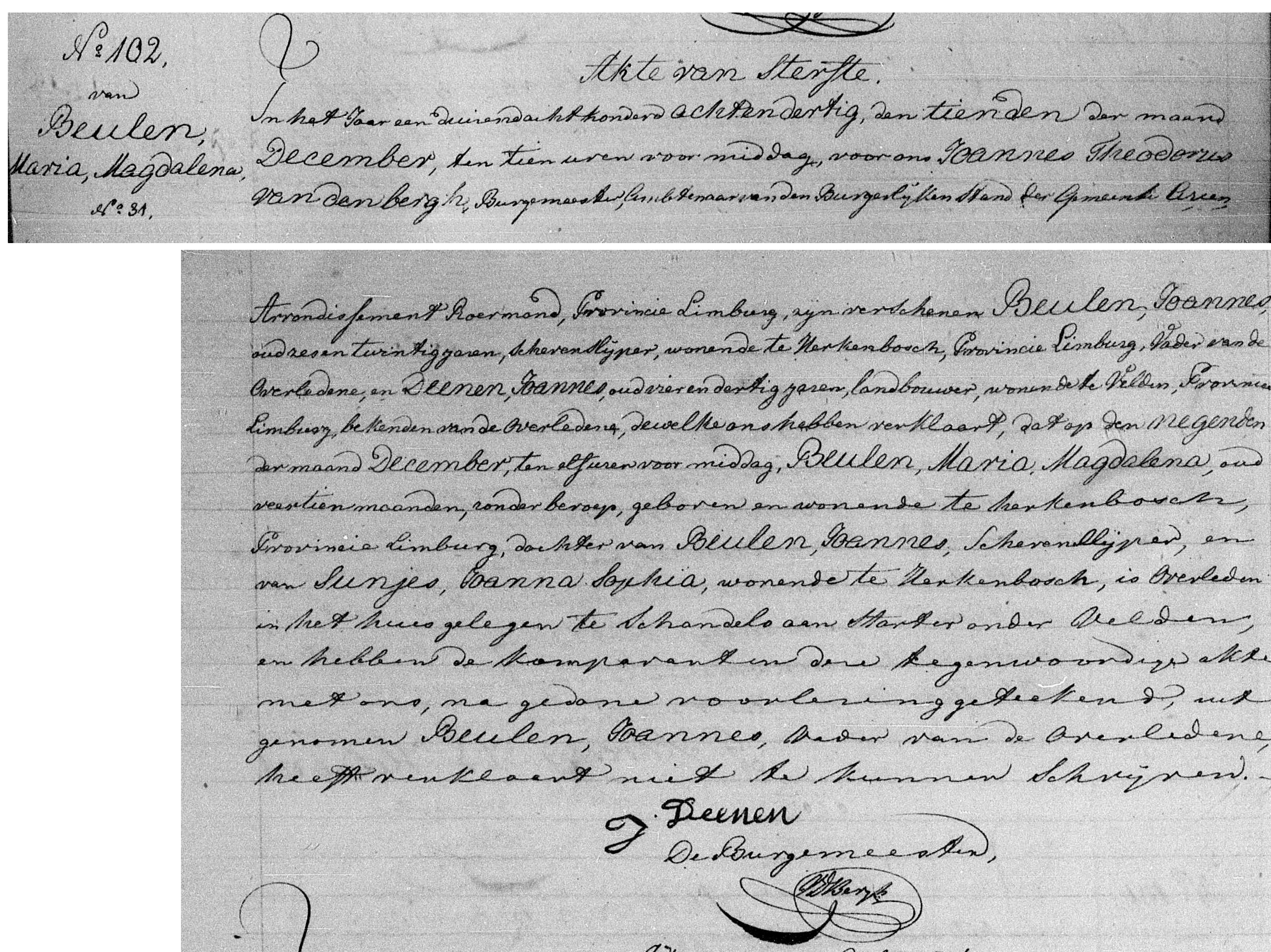 Aangevers: Joannes Beulen, 26 jaar oud, scharenslijper uit Herkenbosch, vader en Joannes Deenen, 34 jaar oud, landbouwer uit Velden, bekende.