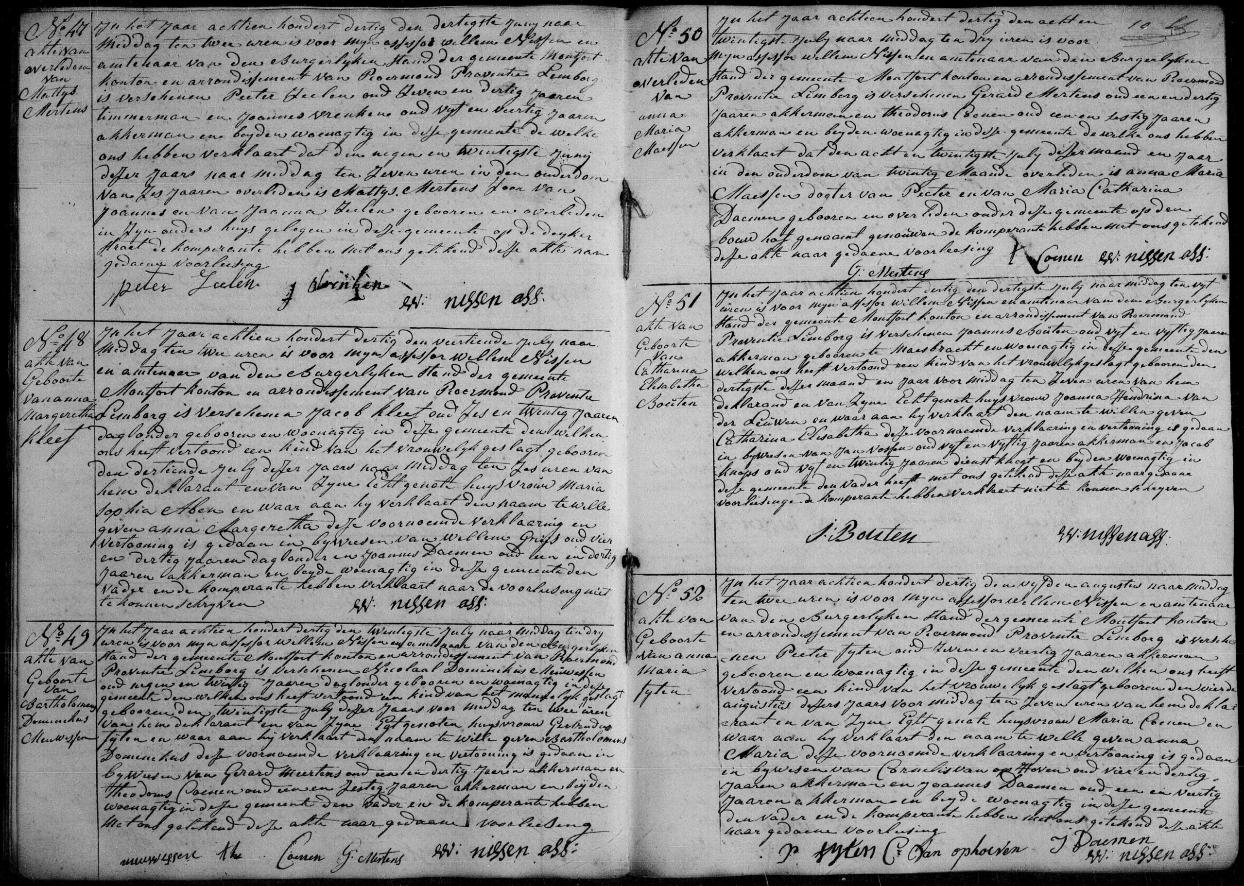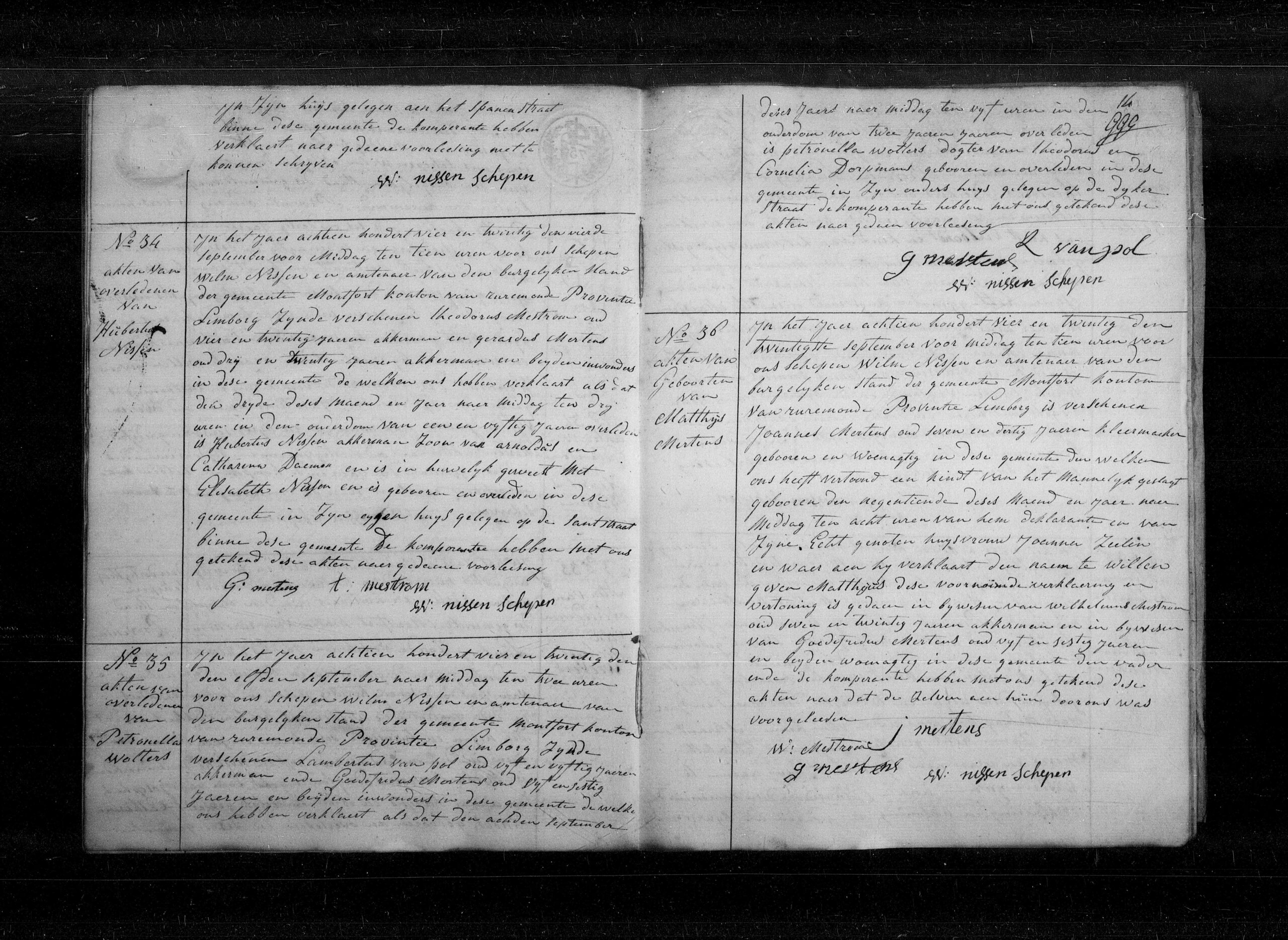Getuigen: Wilhelmus Mestrom, 27 jaar oud, akkerman uit Montfort en Godefridus Mertens, 65 jaar oud, uit Montfort.