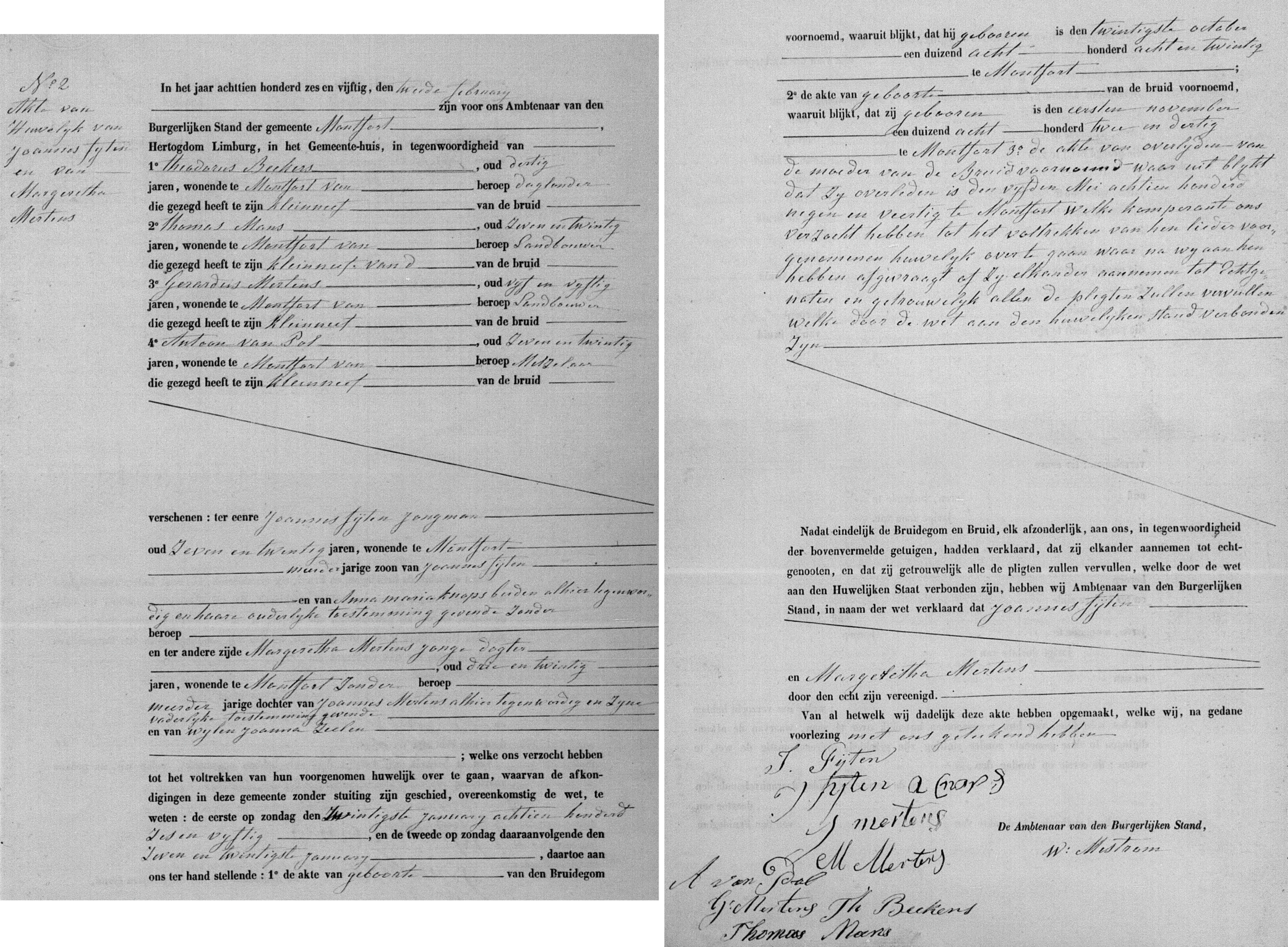 De 27-jarige bruidegom Joannes Fijten (geboren op 20 oktober 1828 te Montfort, zonder beroep) is een zoon van Joannes Fijten en Anna Maria Knops (beiden zonder beroep en aanwezig om toestemming te geven). De 23-jarige bruid Margaretha Mertens (geboren op 1 november 1832 te Montfort, zonder beroep) is een dochter van Joannes Mertens (aanwezig om toestemming te geven) en wijlen Joanna Zeelen (overleden op 5 mei 1849 te Montfort).