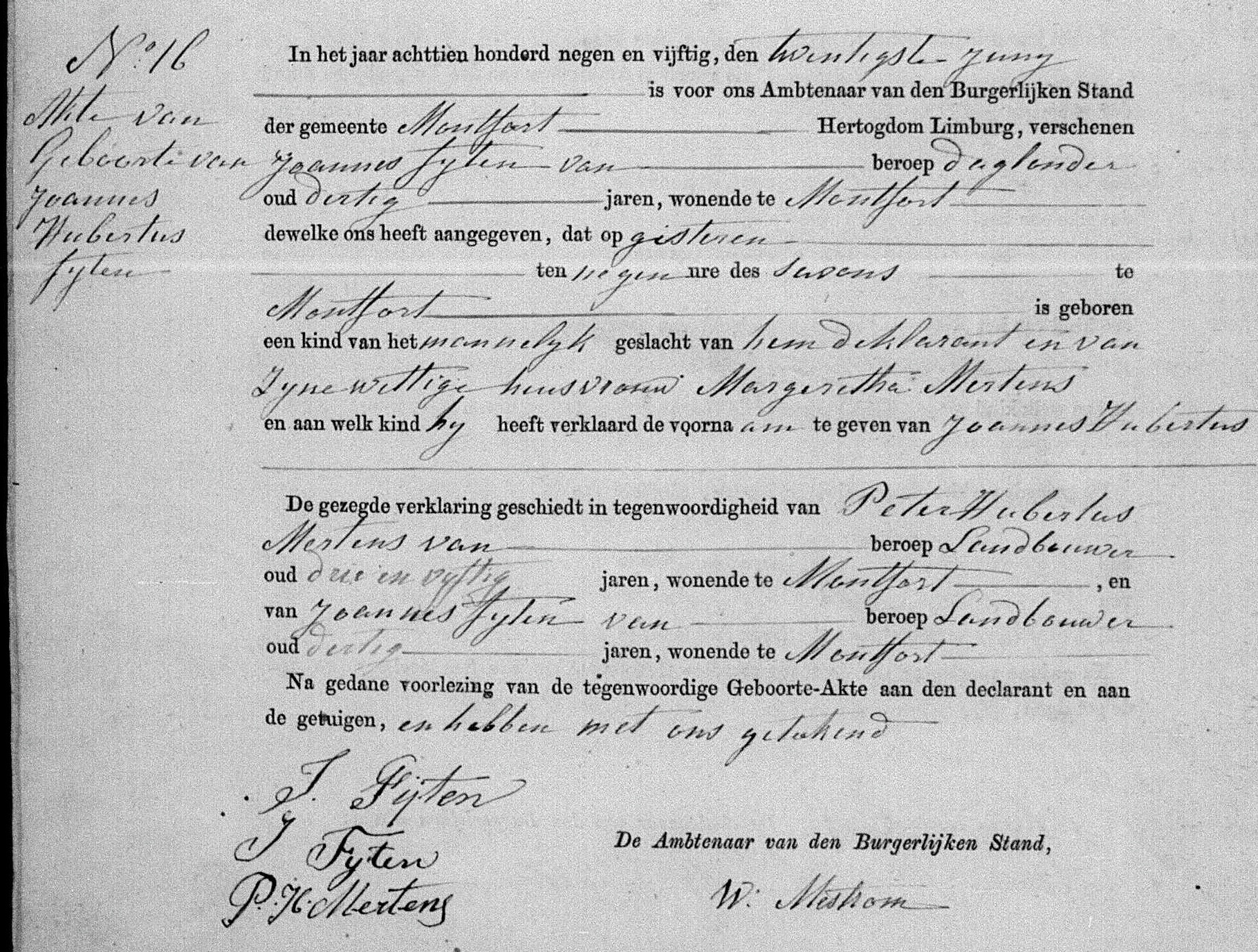 Getuigen: Peter Hubertus Mertens, 53 jaar oud, landbouwer uit Montfort en Joannes Fyten, 30 jaar oud, landbouwer uit Montfort.
