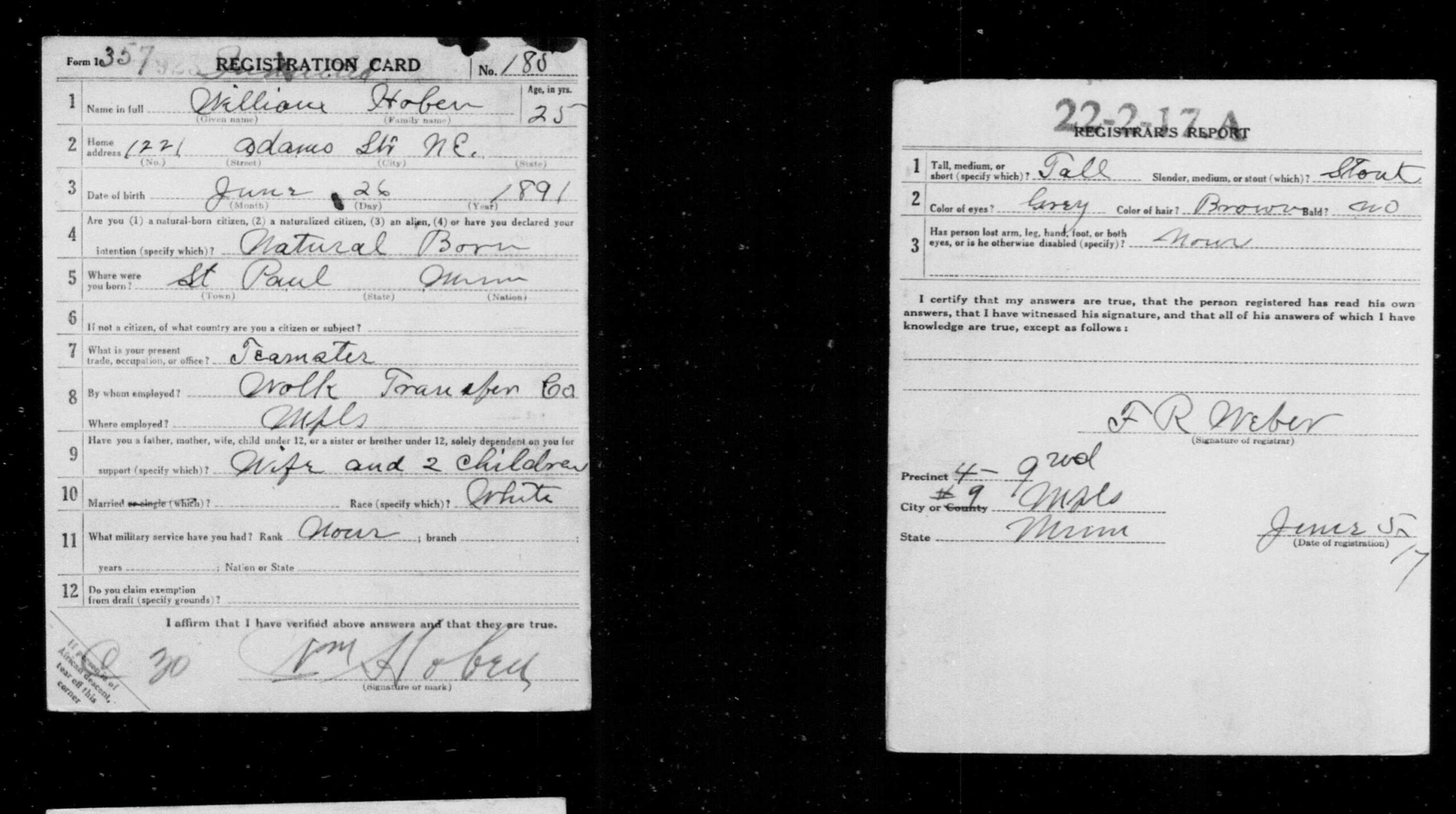 - Bron: S. World War I Draft Registration Cards (Form 1, nr. 185, Precinct 4, Minneapolis).